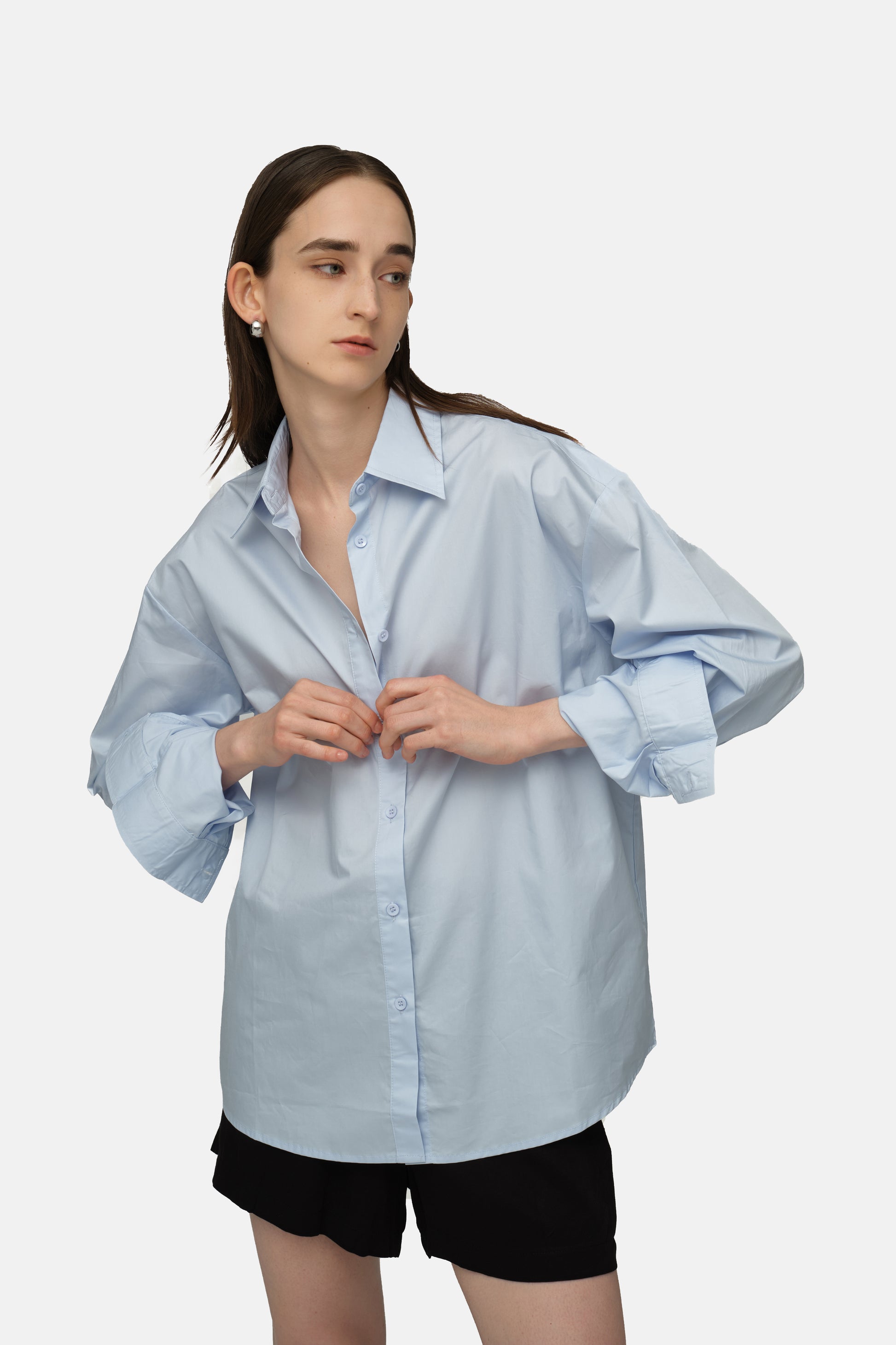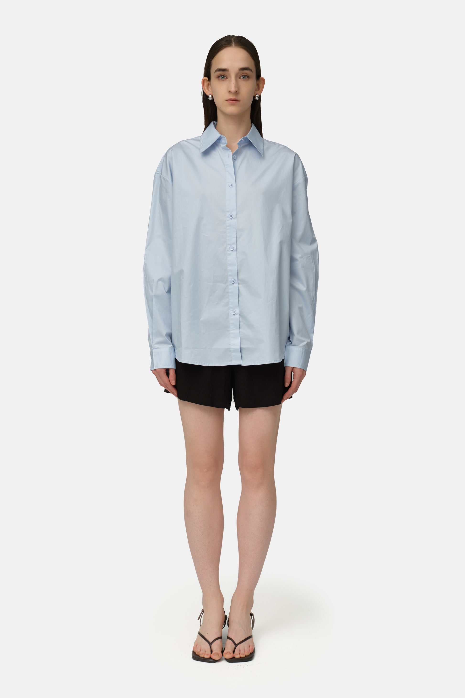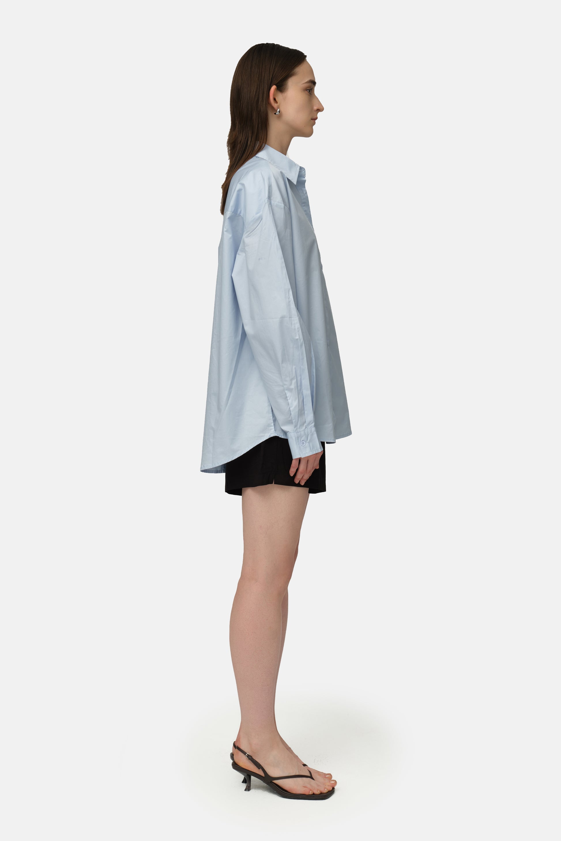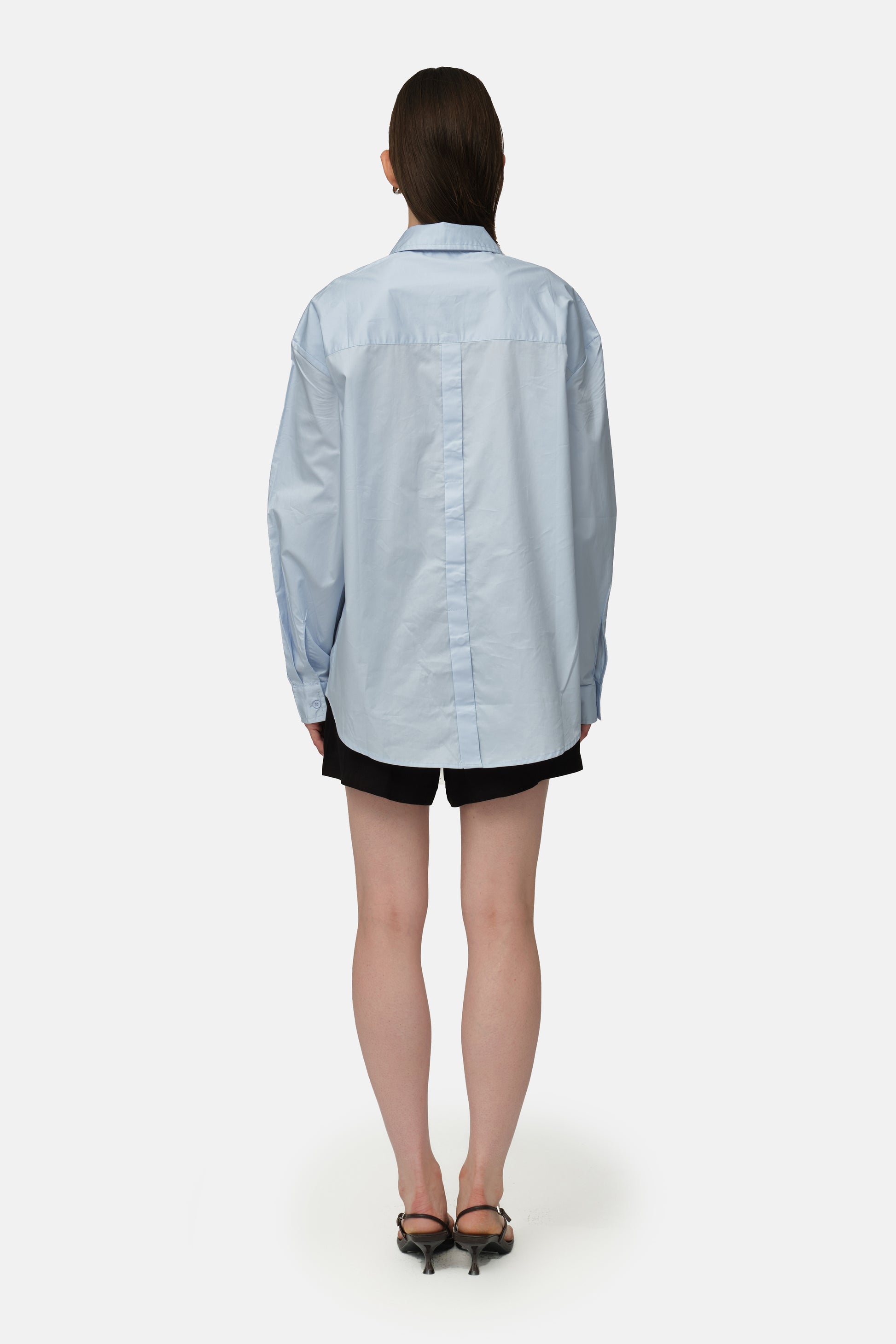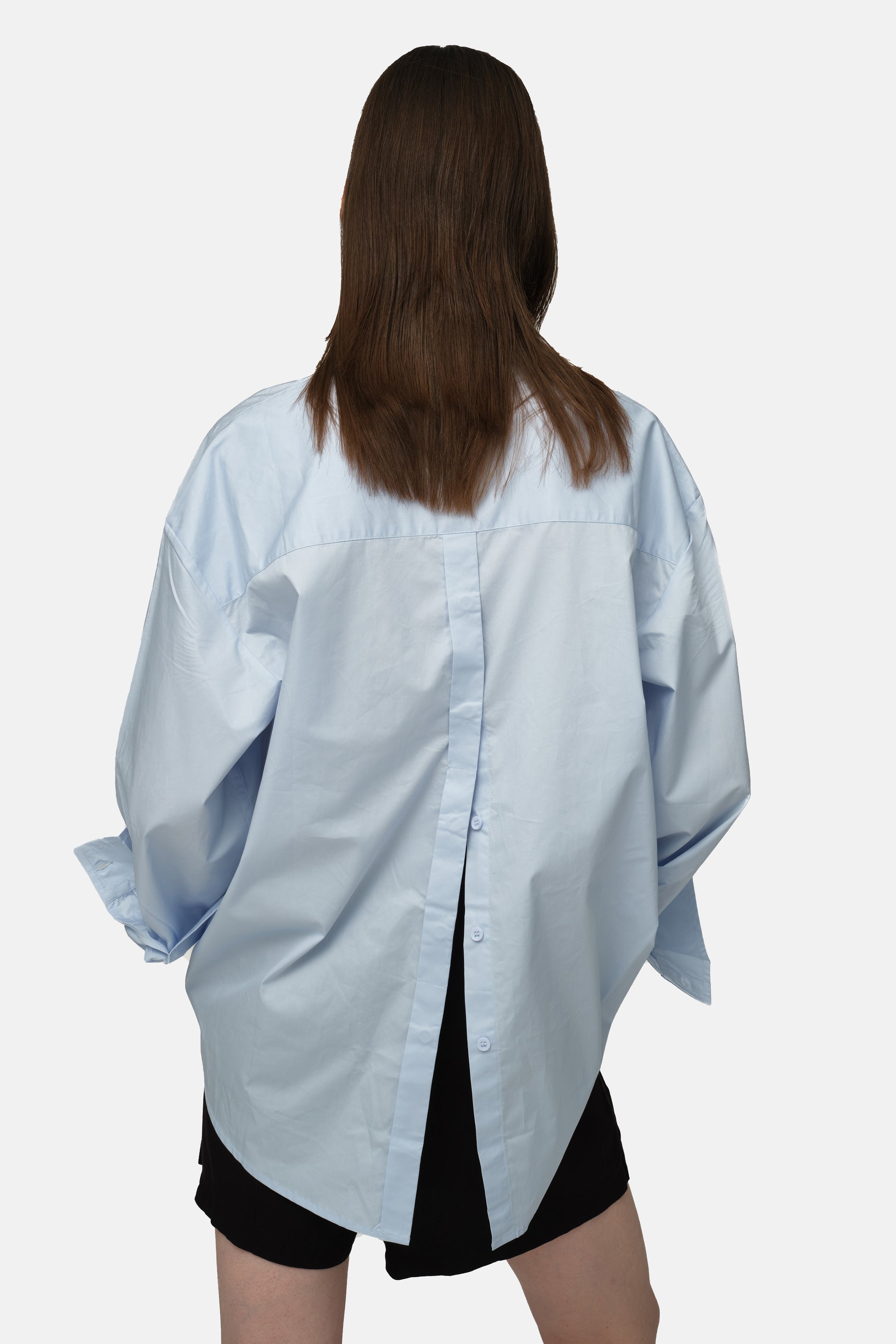 The Azure Shirt features a classic, relaxed silhouette in a soft blue hue. Crafted from lightweight poplin, it combines a unique back button detail with a 100% cotton, making it a versatile and comfortable addition to your wardrobe. Ideal for both holiday vibes and professional settings.