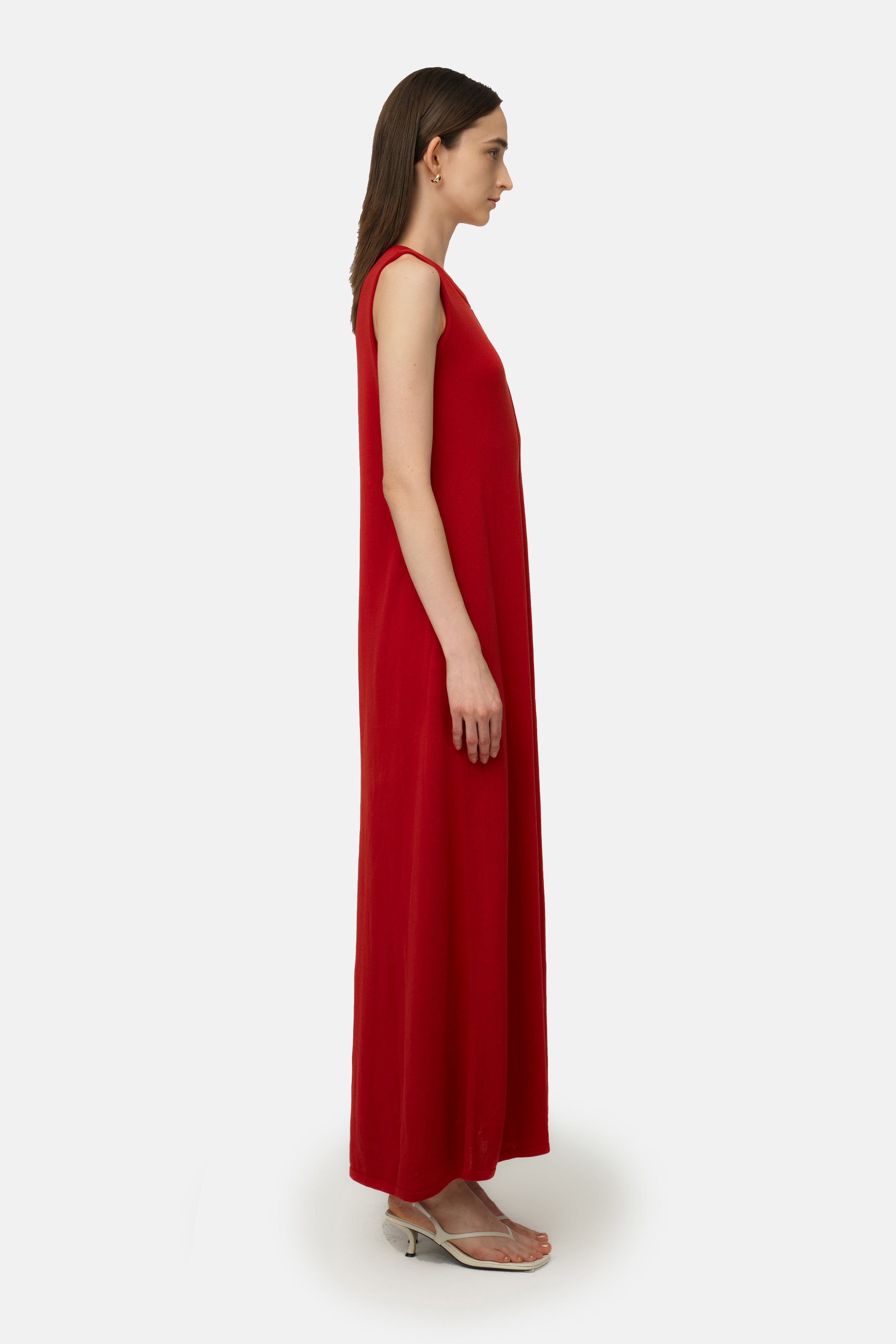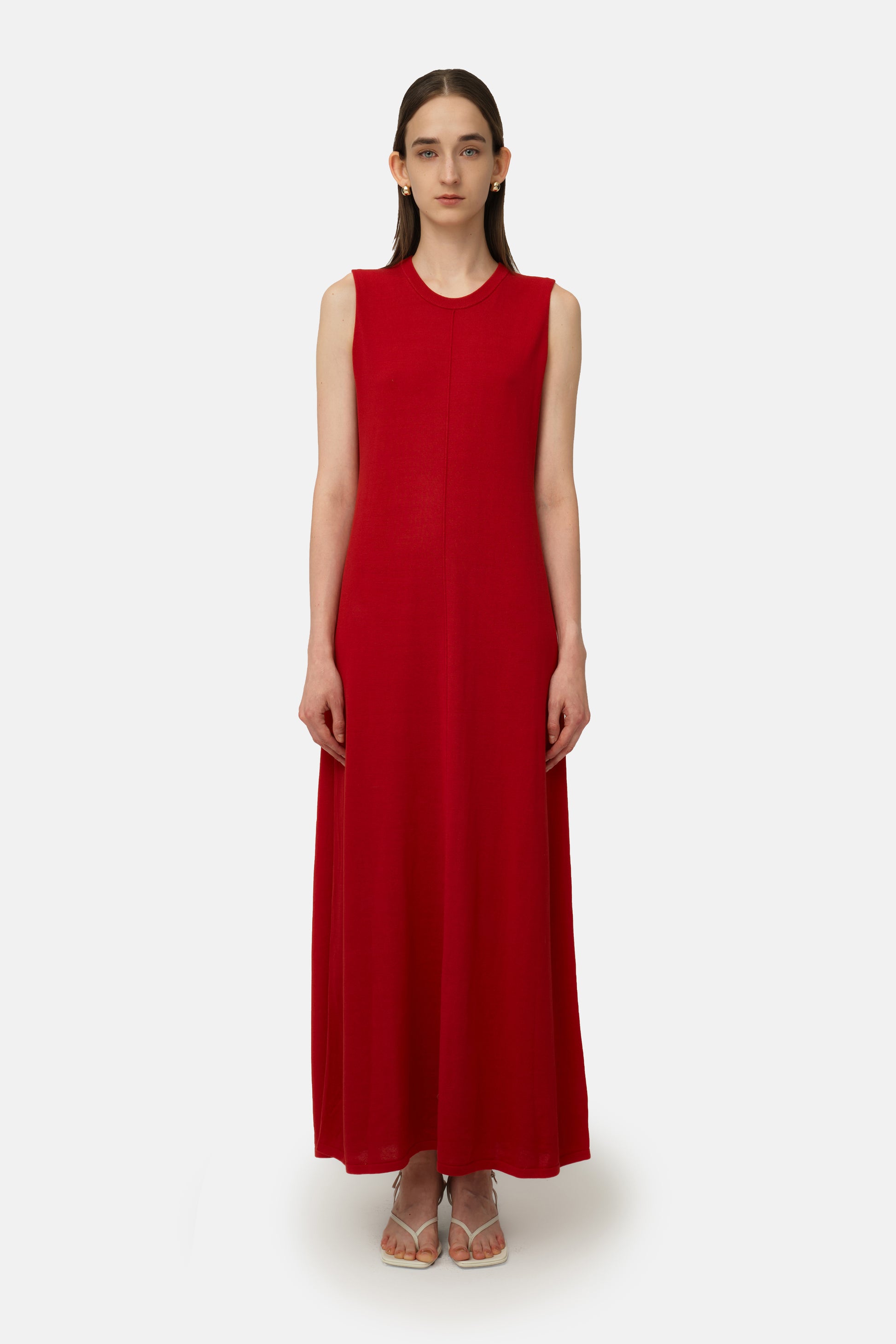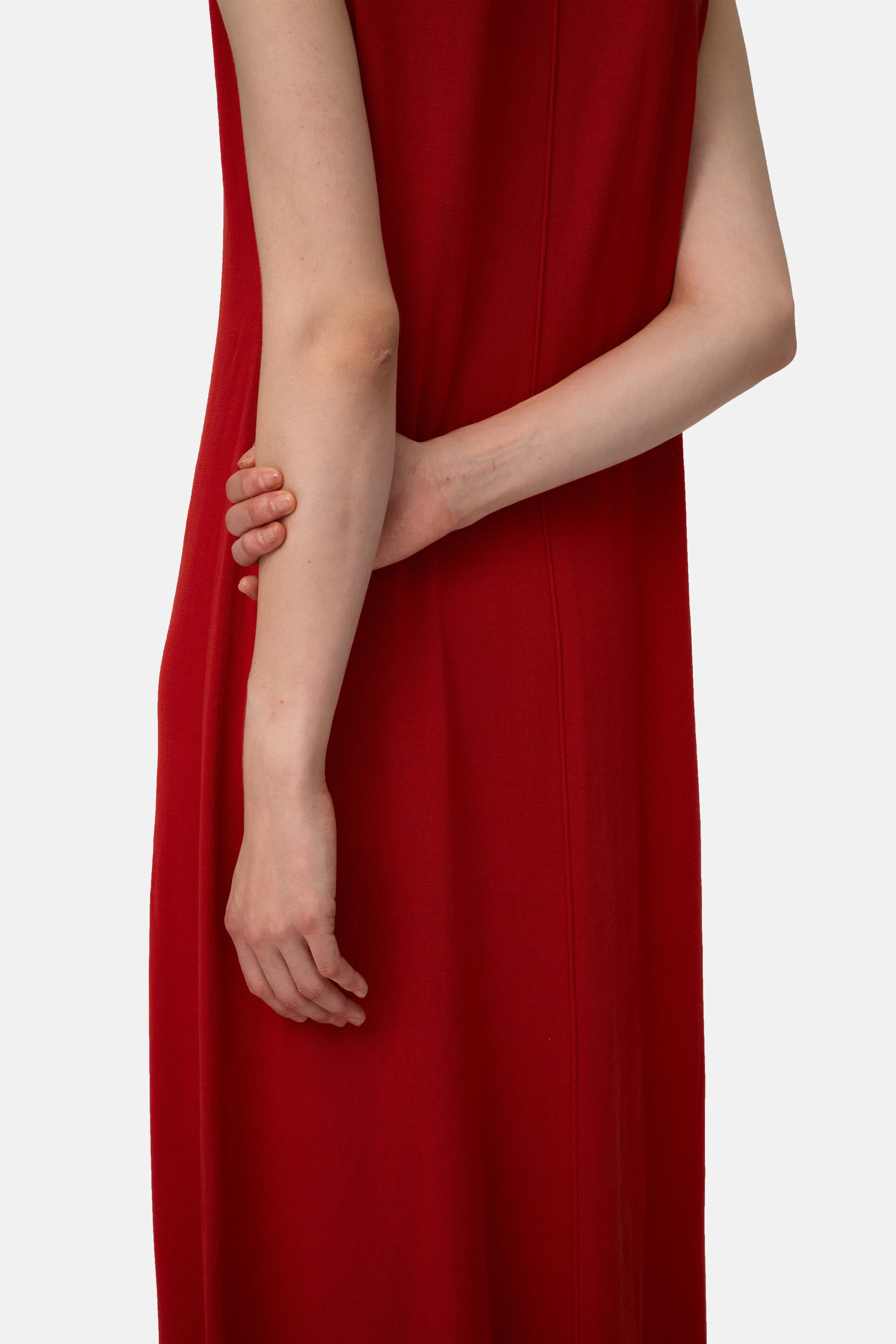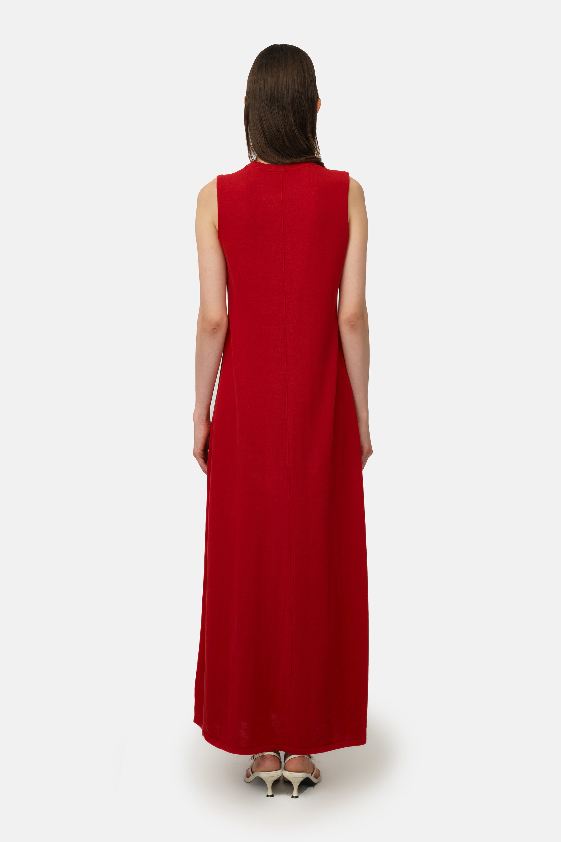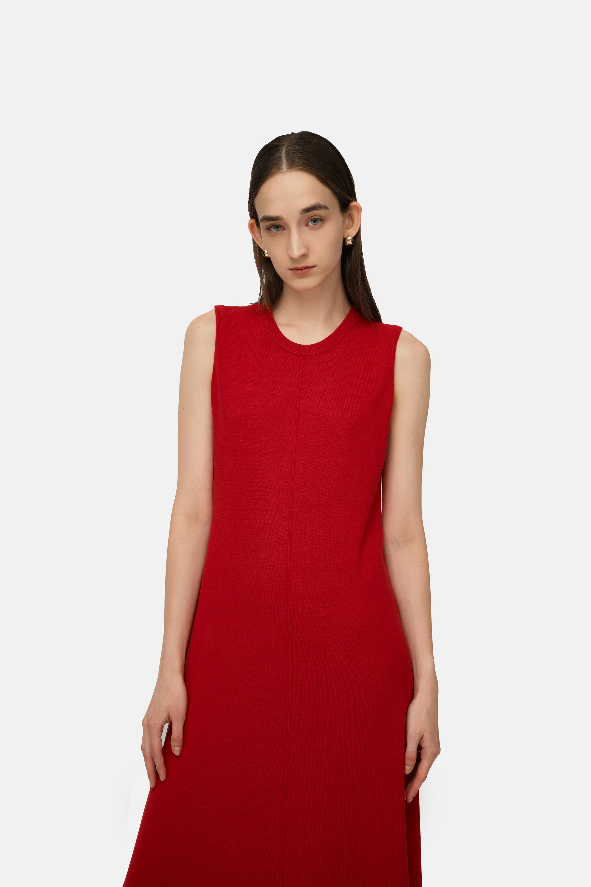 Crafted from a soft breathable TENCEL fabric in a flattering silhouette. Boasting a crew neckline with a middle line down to the bottom. Sleeveless silhouette lining to a maxi length. The Carmine Maxi Dress is designed to drape effortlessly and an elevated basic for all-day wear.