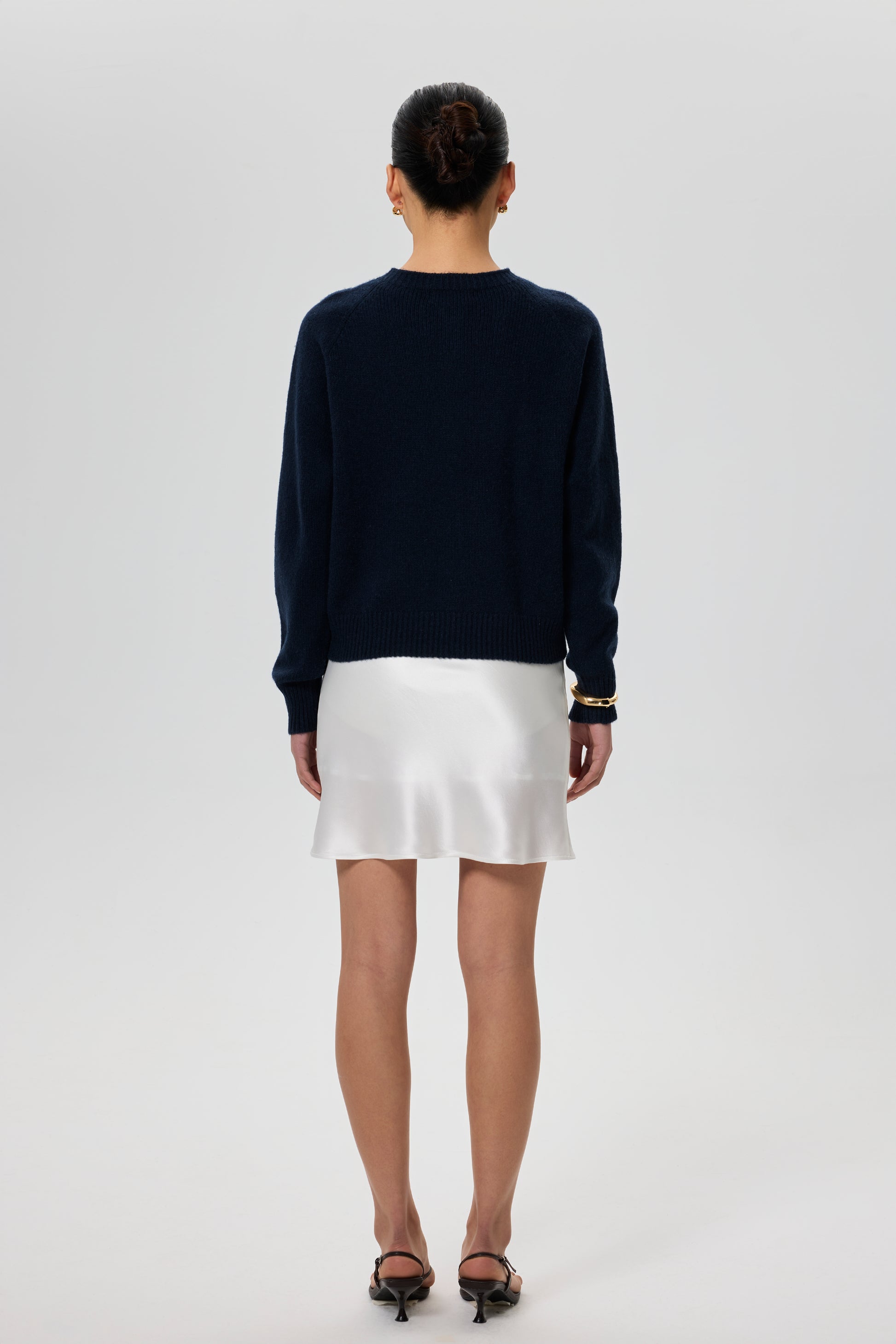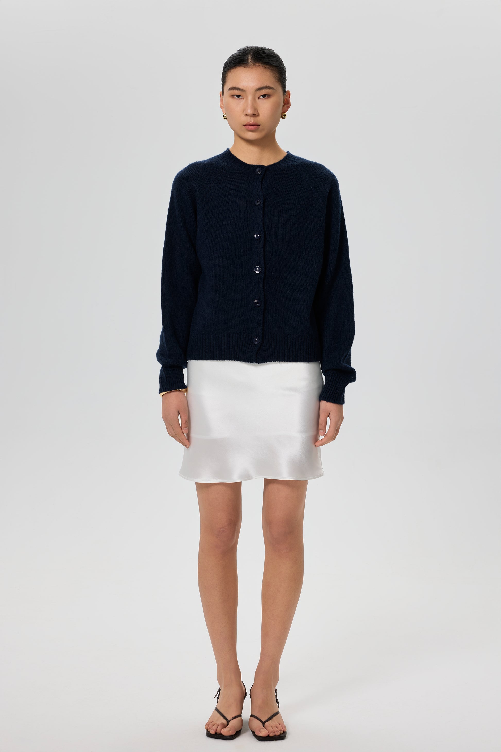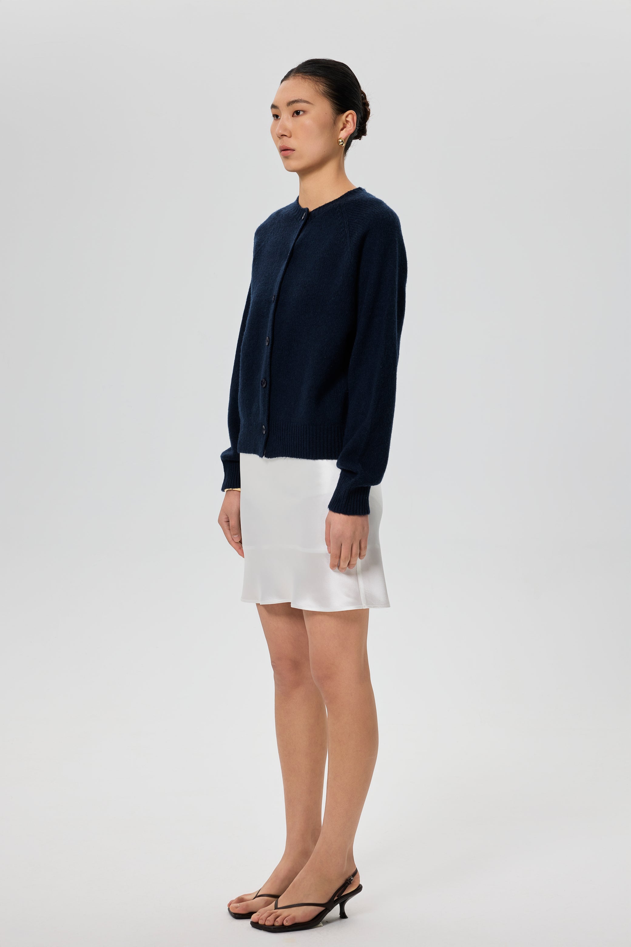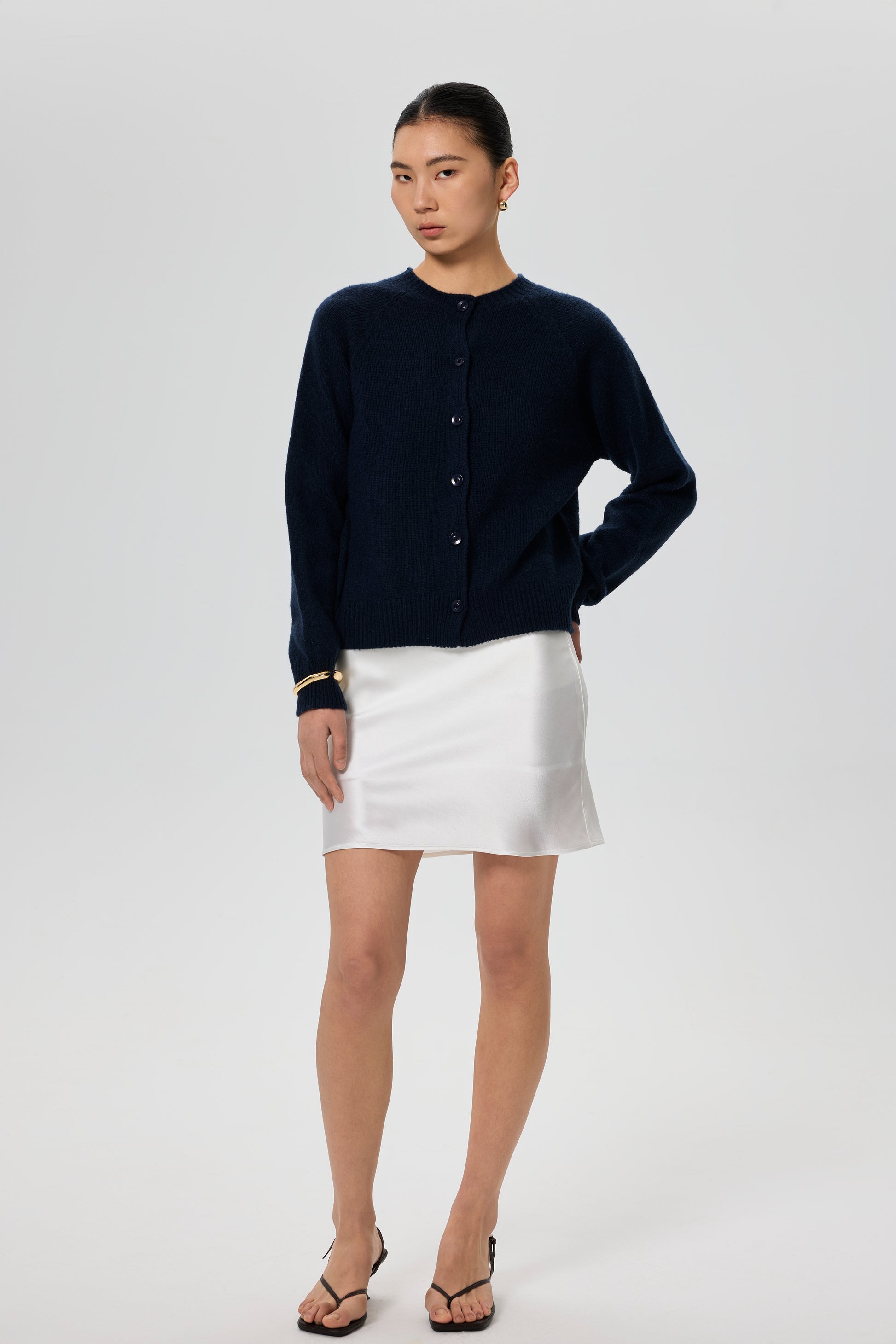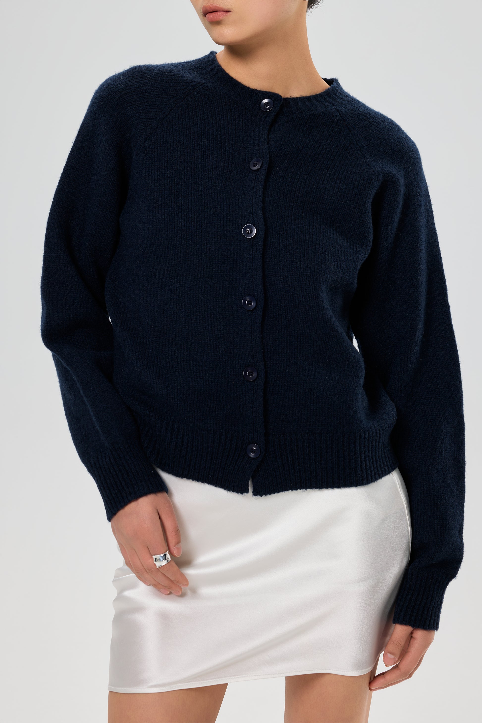 Crafted from 100% merino wool, the Rhea Merino Cardi offers both warmth and breathability in a rich midnight blue hue. Designed for a relaxed fit with a drop shoulder, it features ribbed trims and smooth resin buttons for a refined finish. Its slightly cropped silhouette sits just below the hip, making it versatile for layering over casual pieces like denim or pairing with tailored trousers for a more polished look.