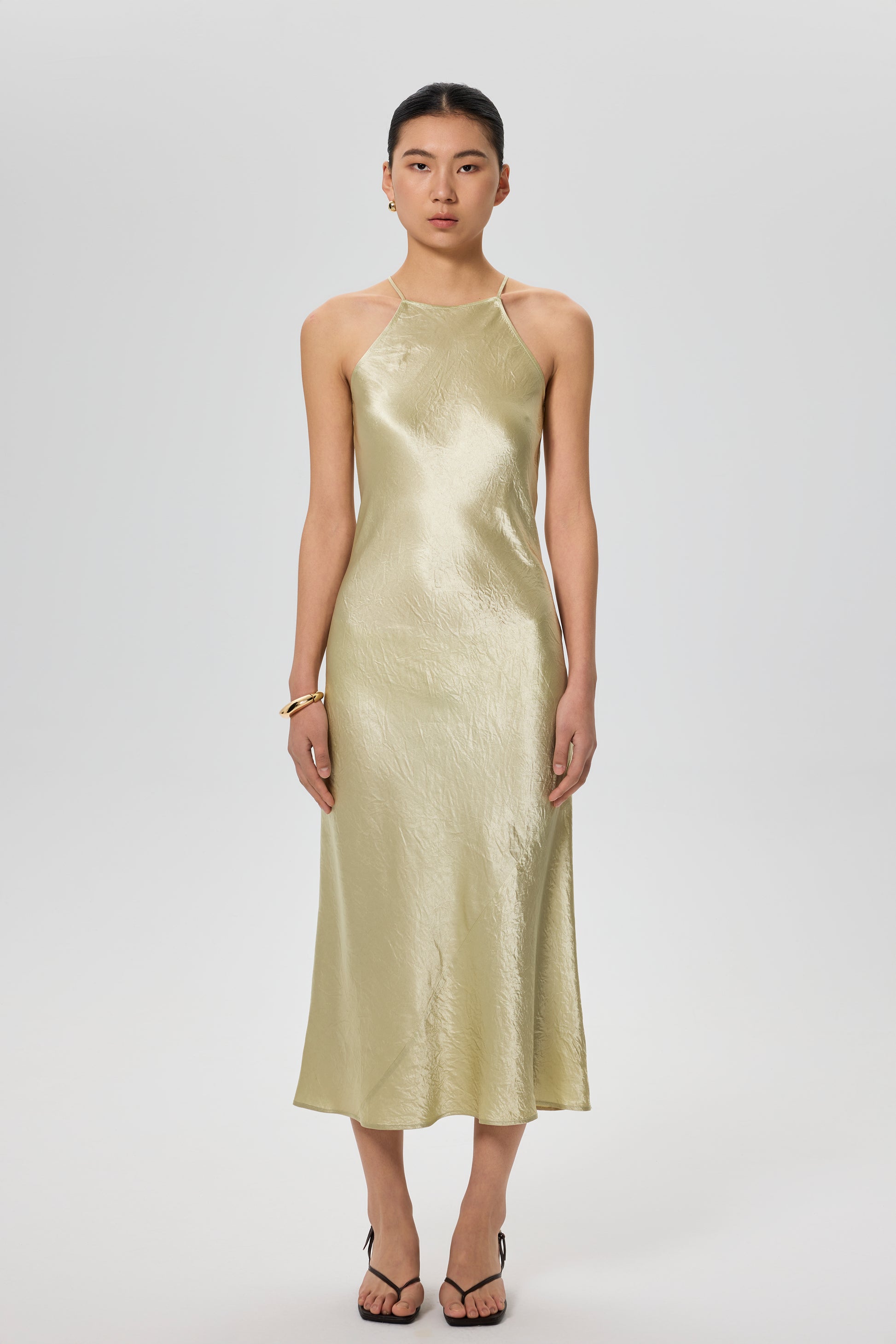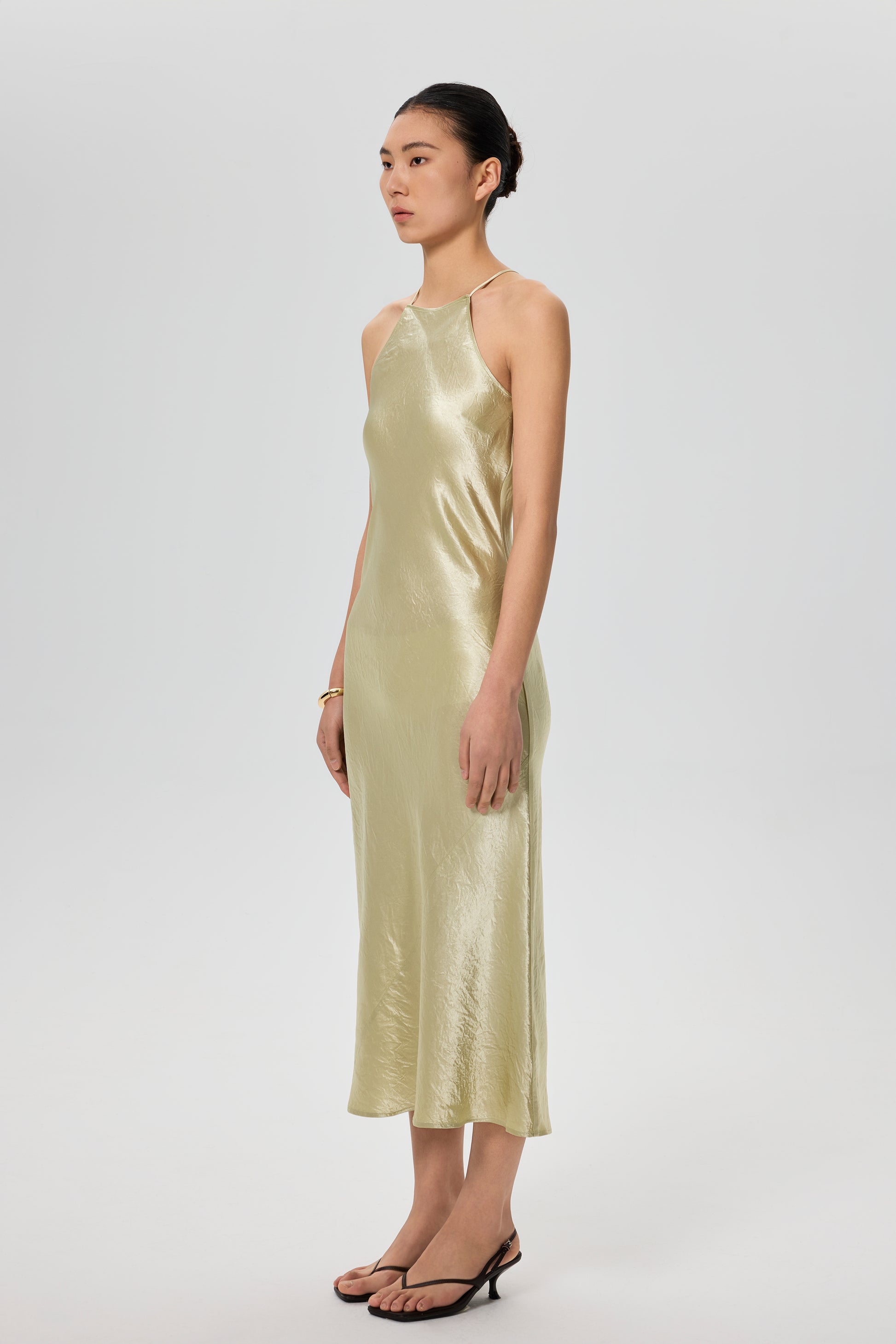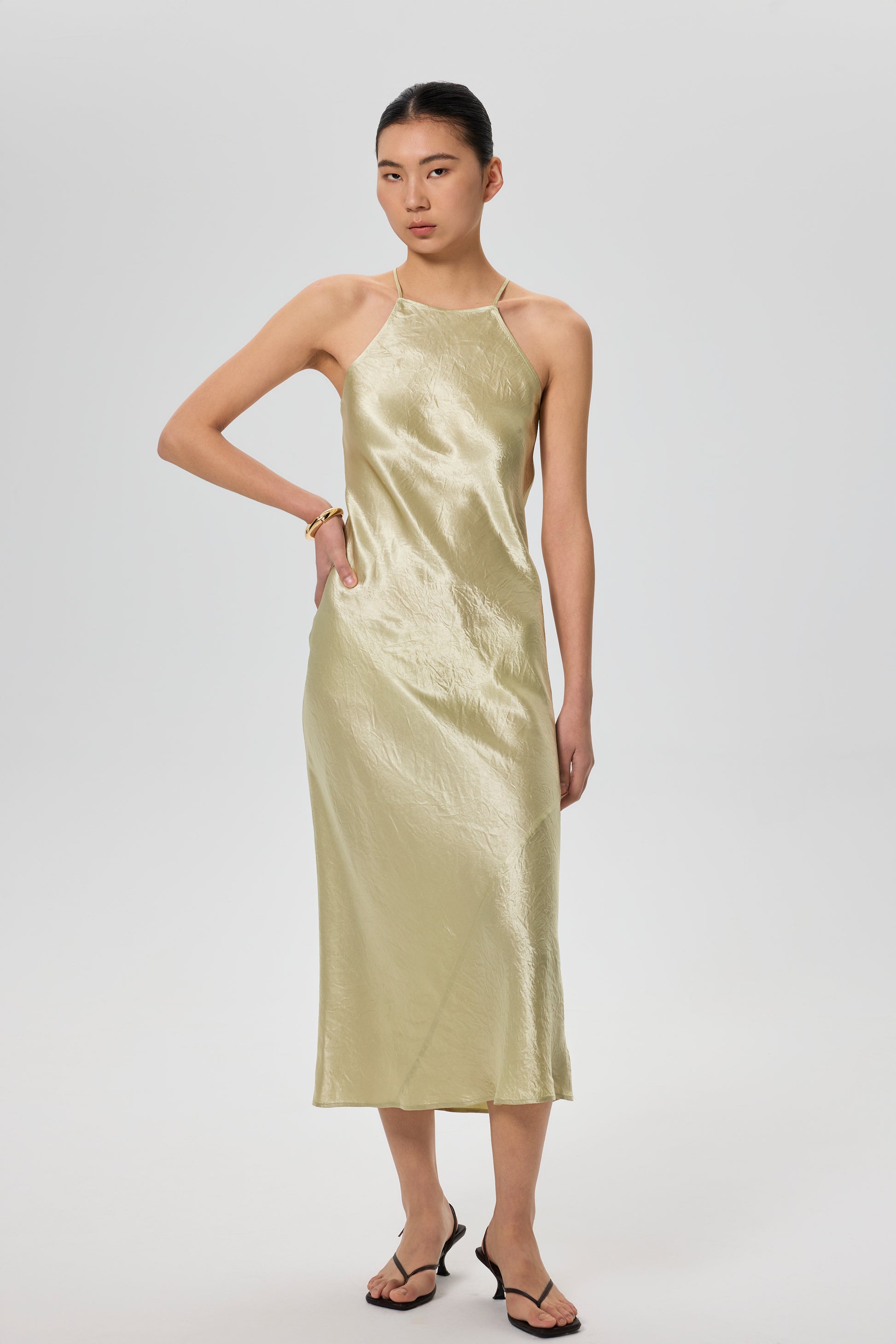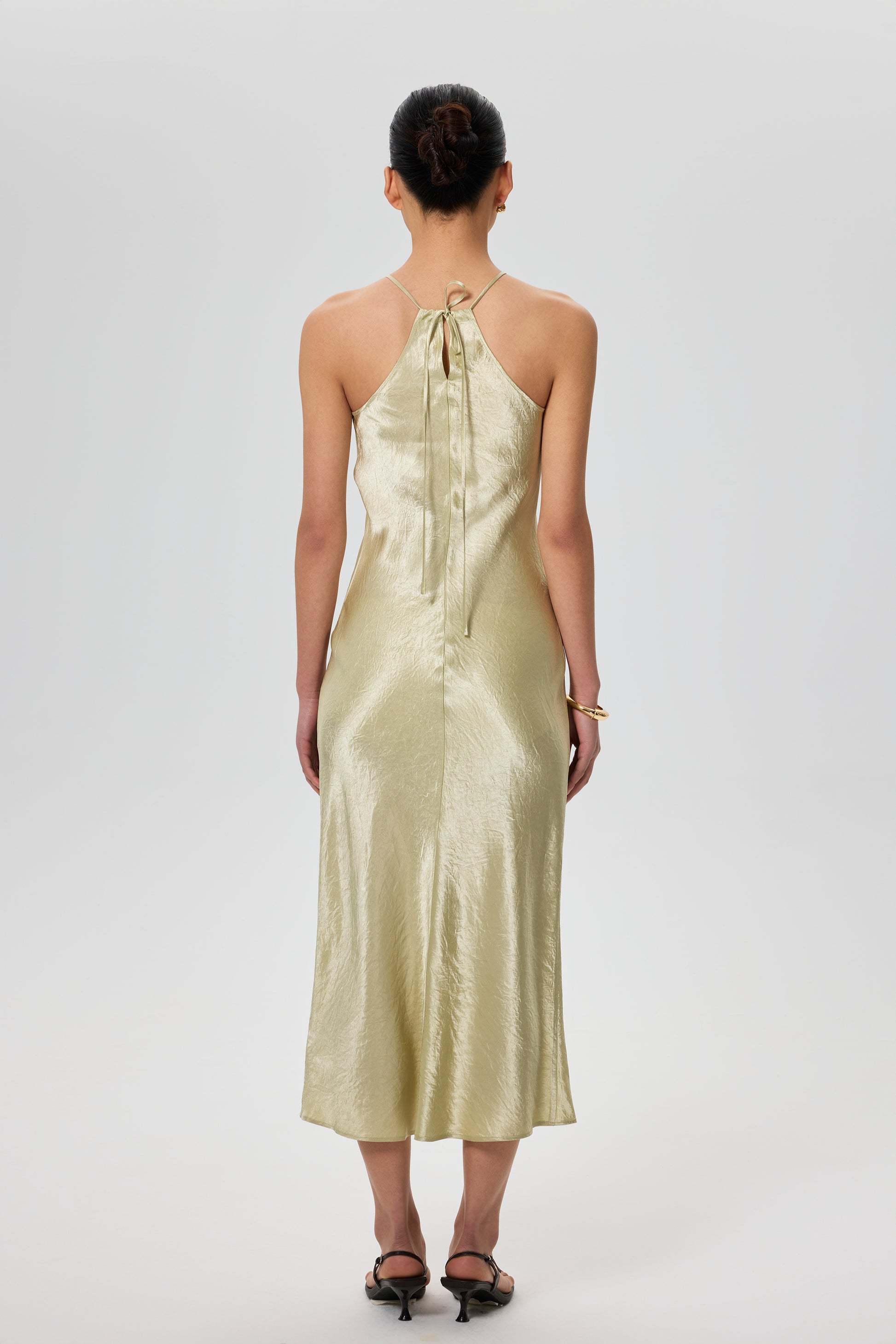 The Demetria Dress reimagines relaxed elegance with a light olive hue and luxurious triacetate fabric. Featuring a halter neck design, this dress is beautifully minimalist, with an innovative cut that leaves the shoulders bare and focuses on the sculptural lines of the front chest. Perfect for holiday getaways, resort settings or glamorous evenings alike.