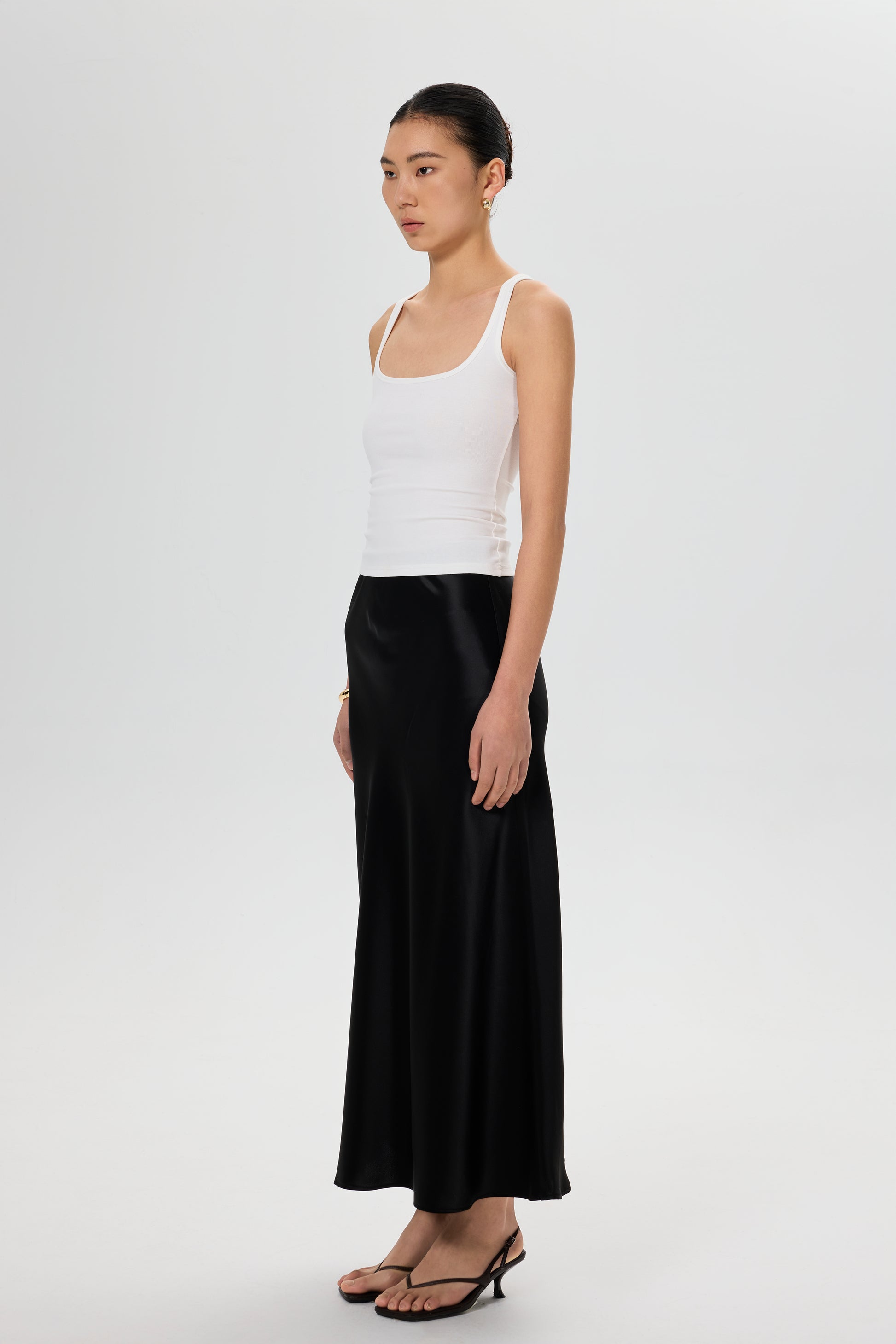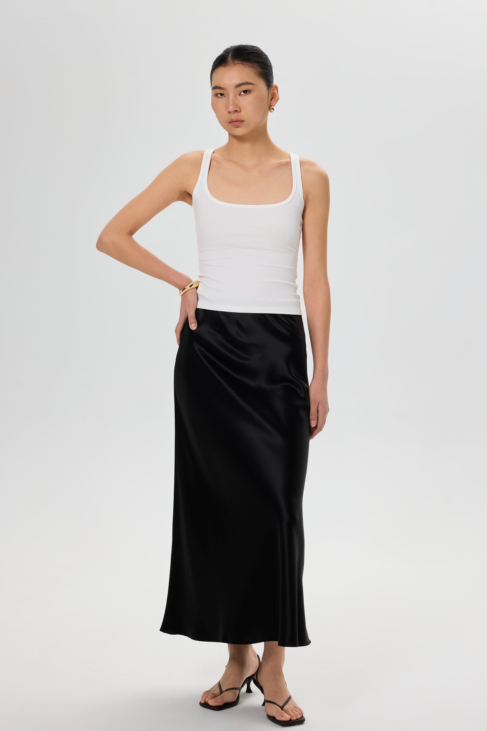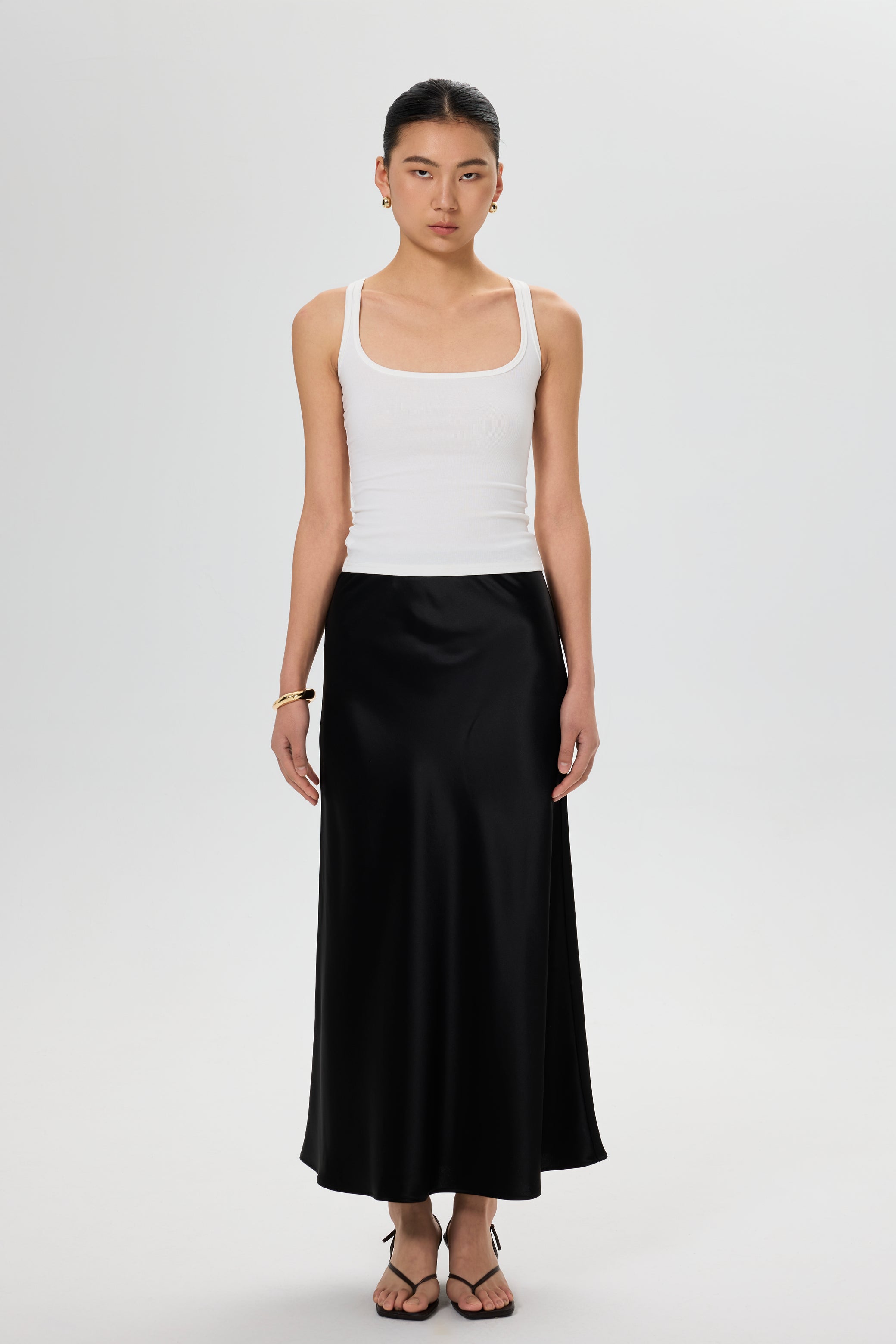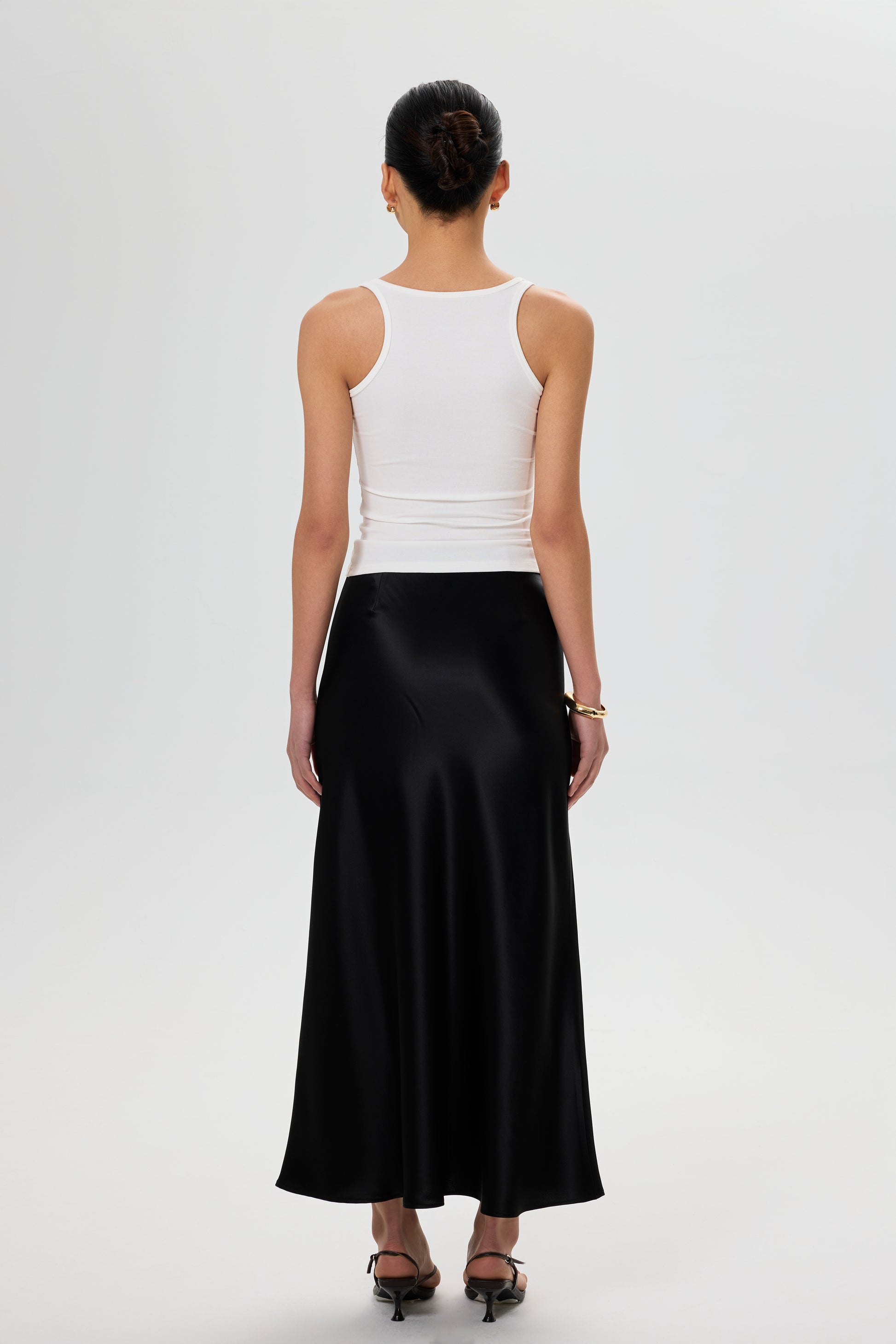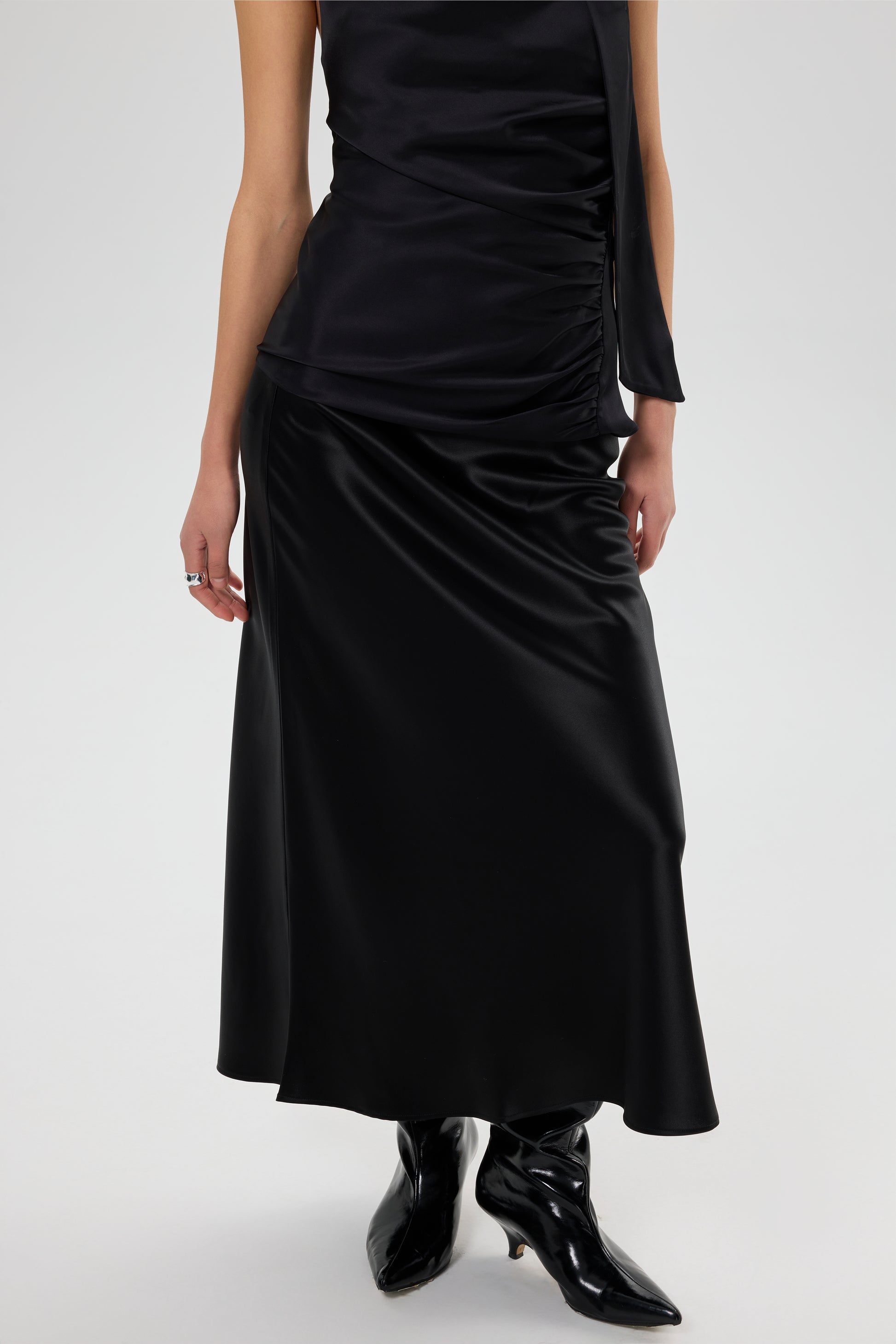 A versatile piece crafted from luxurious black triacetate. With its flattering A-line silhouette and sleek, smooth texture, this skirt is perfect for both holiday getaways, office settings and everyday wear. Its mid-rise cut and midi-length length offer a modern, feminine fit, while the lightweight fabric ensures all-day comfort.