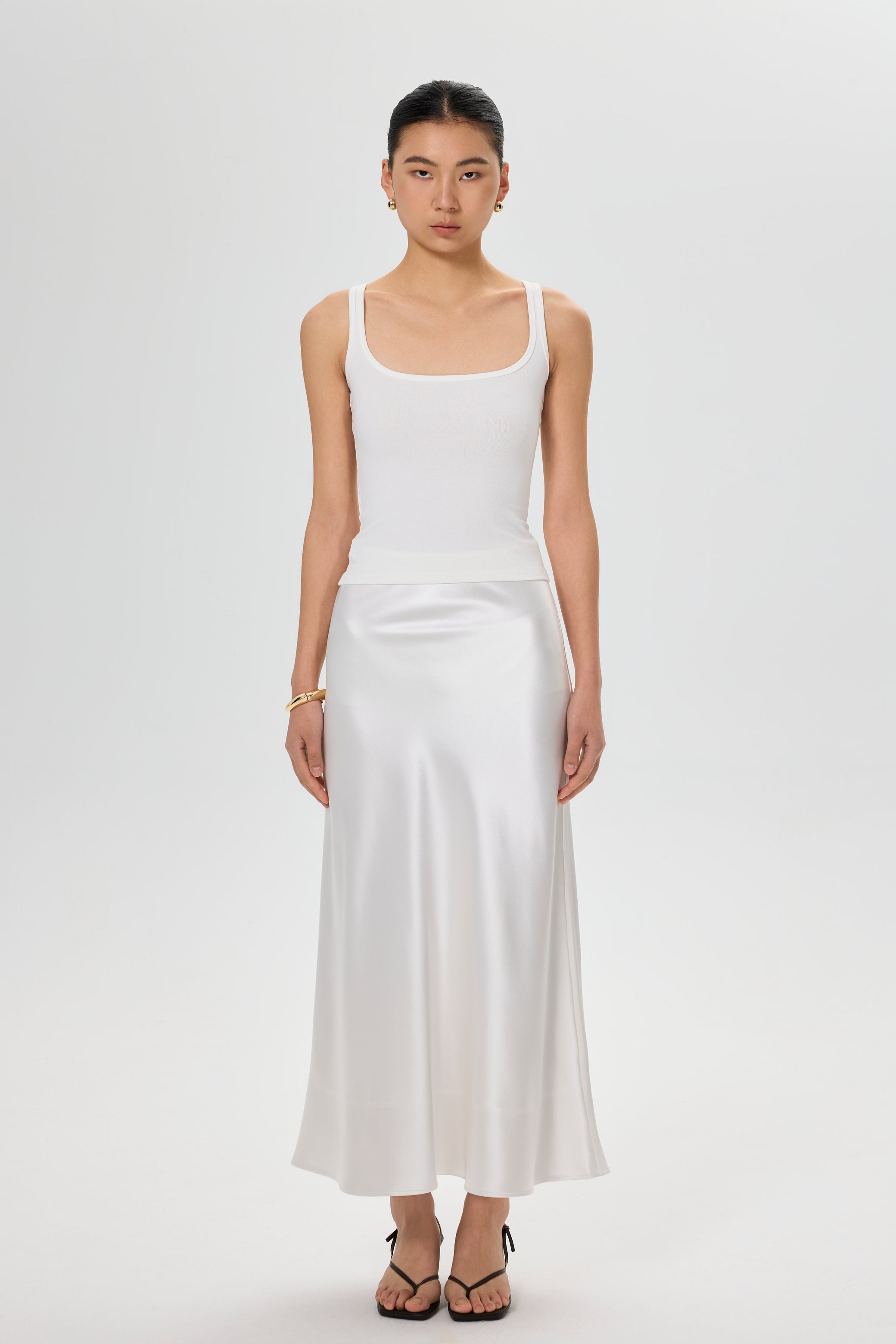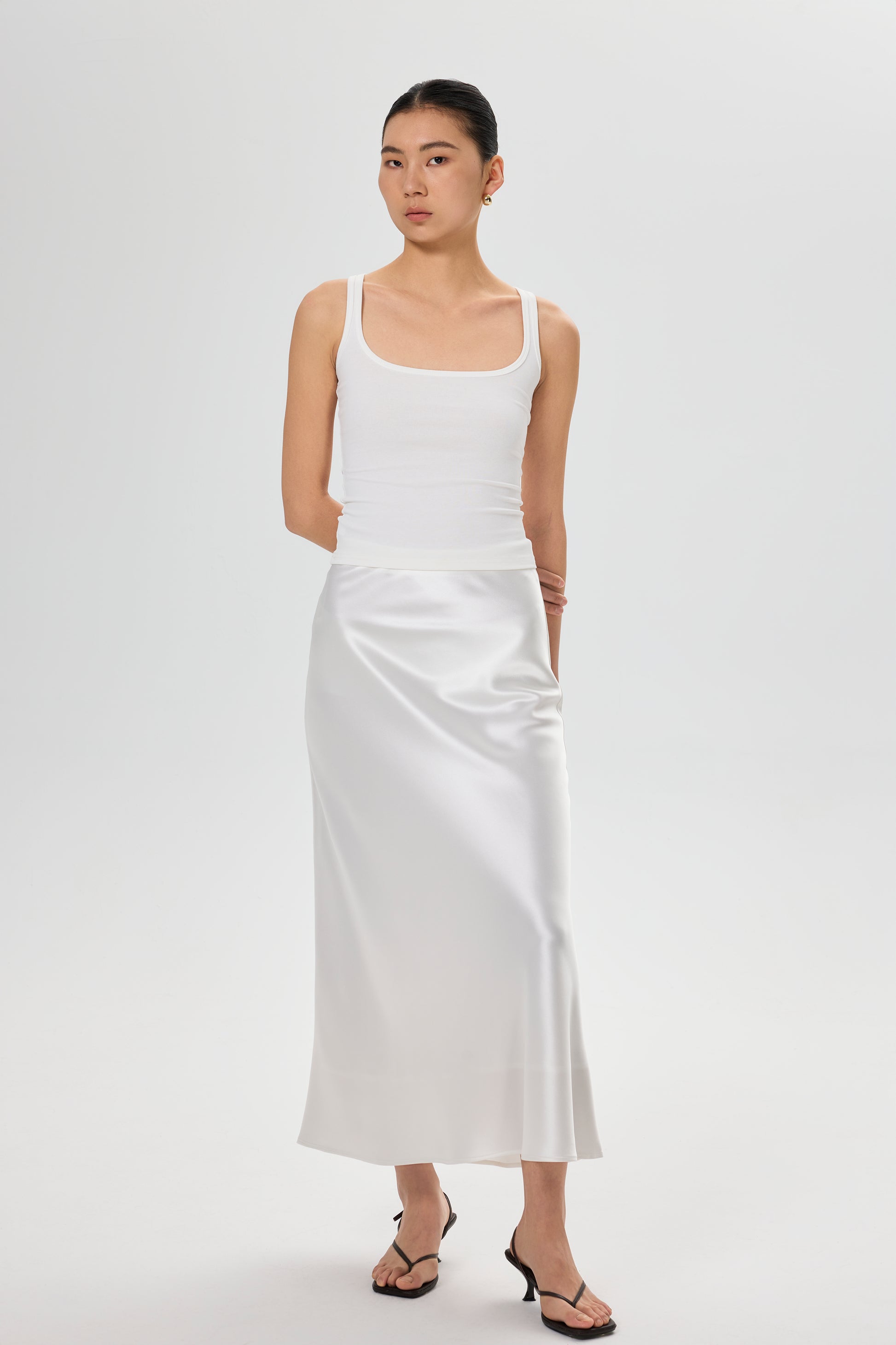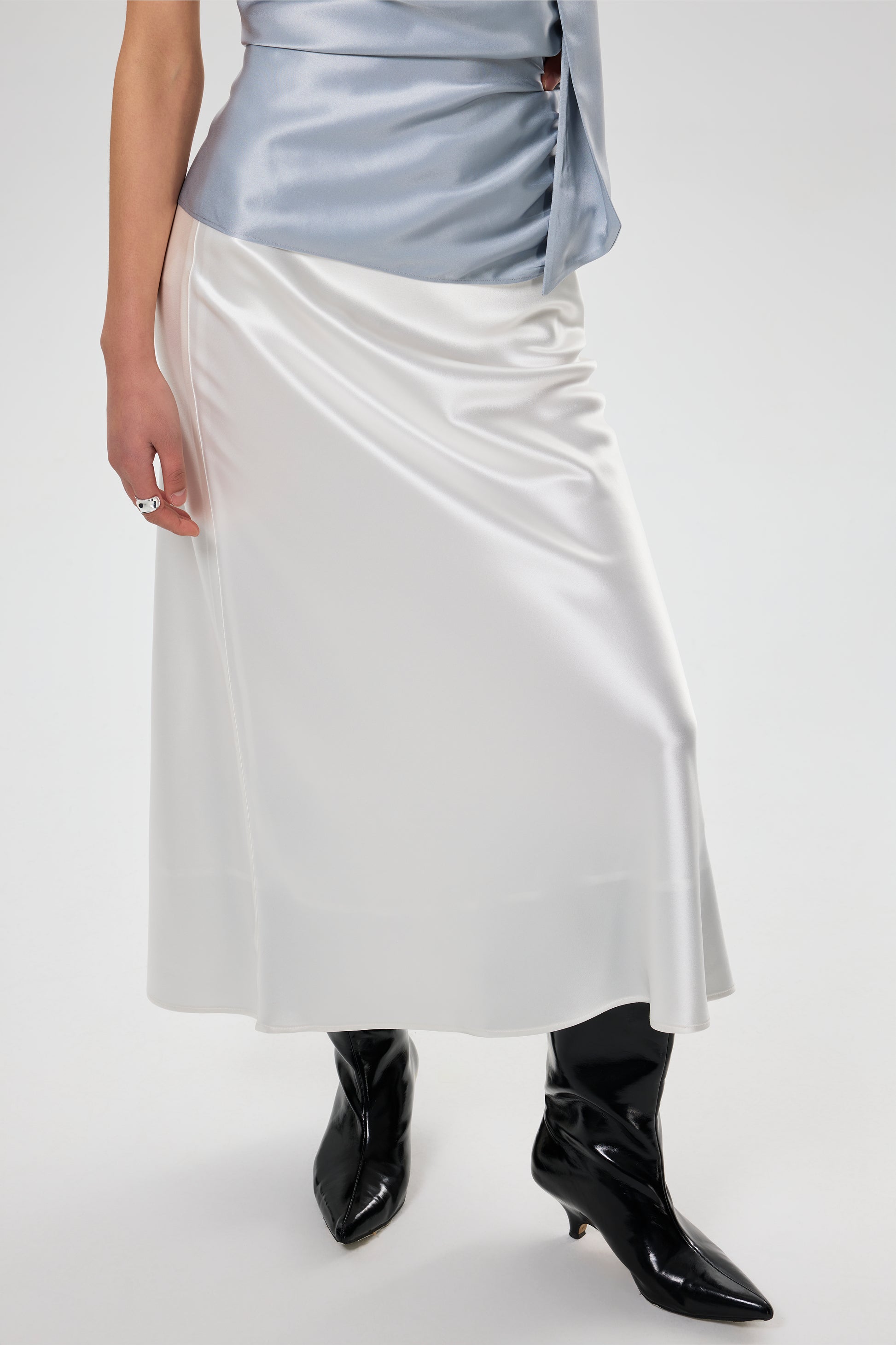 A versatile piece crafted from luxurious pearl triacetate. With its flattering A-line silhouette and sleek, smooth texture, this skirt is perfect for both holiday getaways, office settings and everyday wear. Its mid-rise cut and midi-length length offer a modern, feminine fit, while the lightweight fabric ensures all-day comfort.