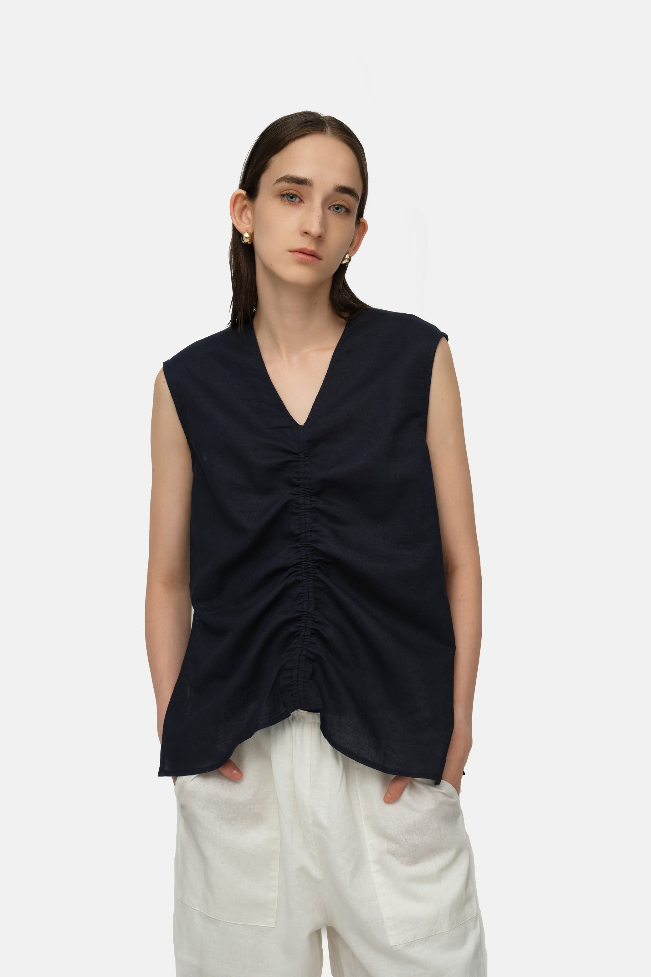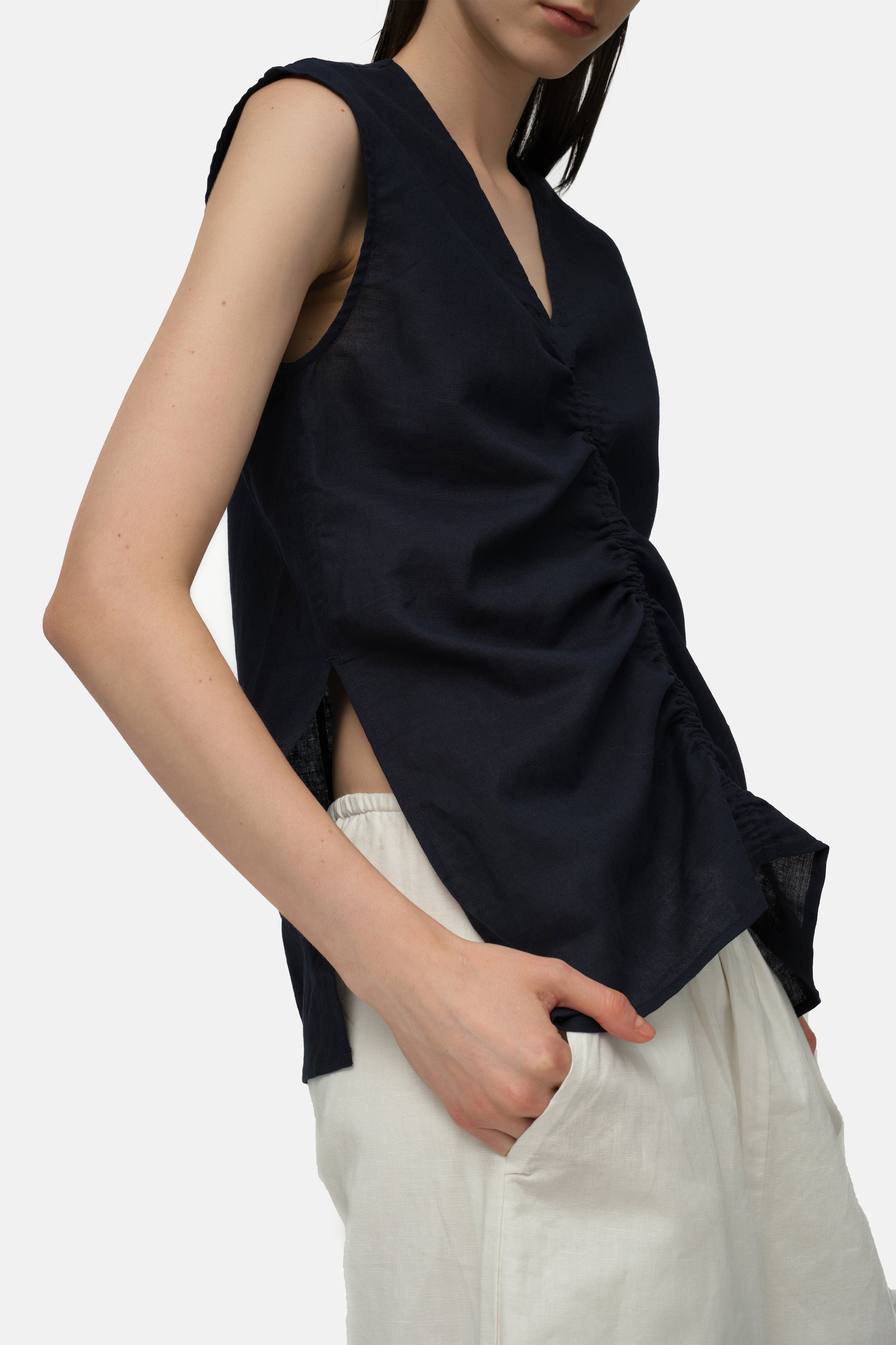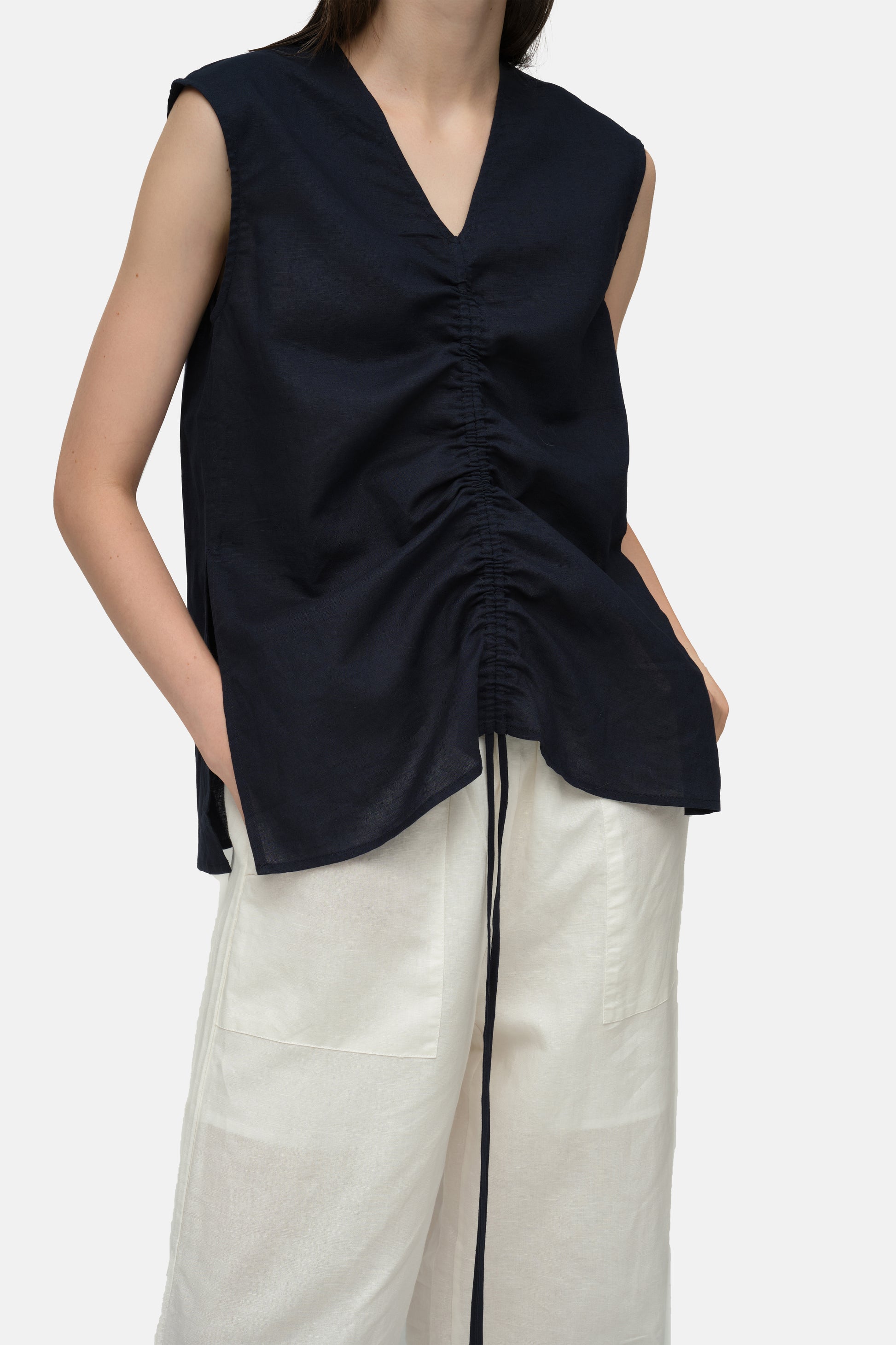 Crafted from a signature linen and cotton blend, the Luna Drawstring Top boasts a distinctive drawstring silhouette. Its unique midnight colour adds a touch of sophistication, making this top a standout piece. Perfect for adding a refined and stylish element to any wardrobe.
