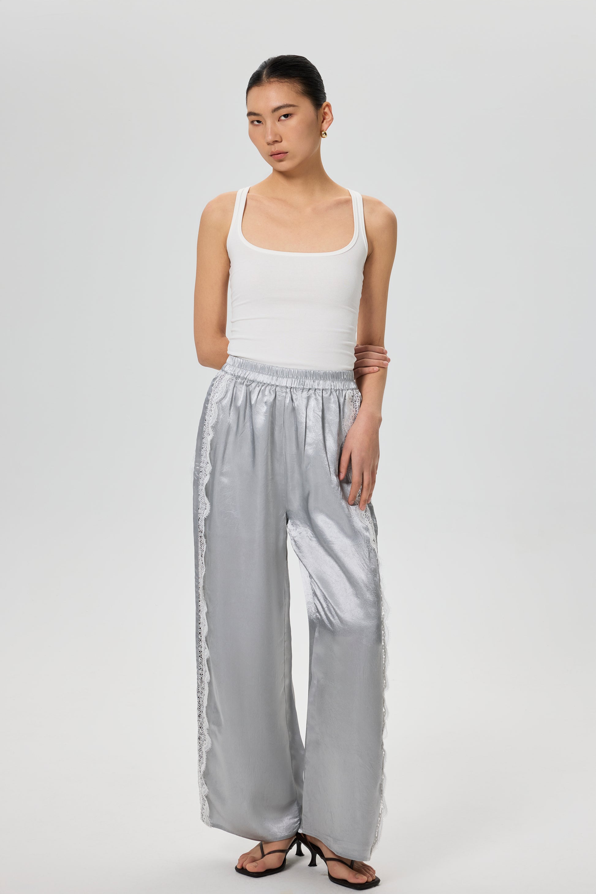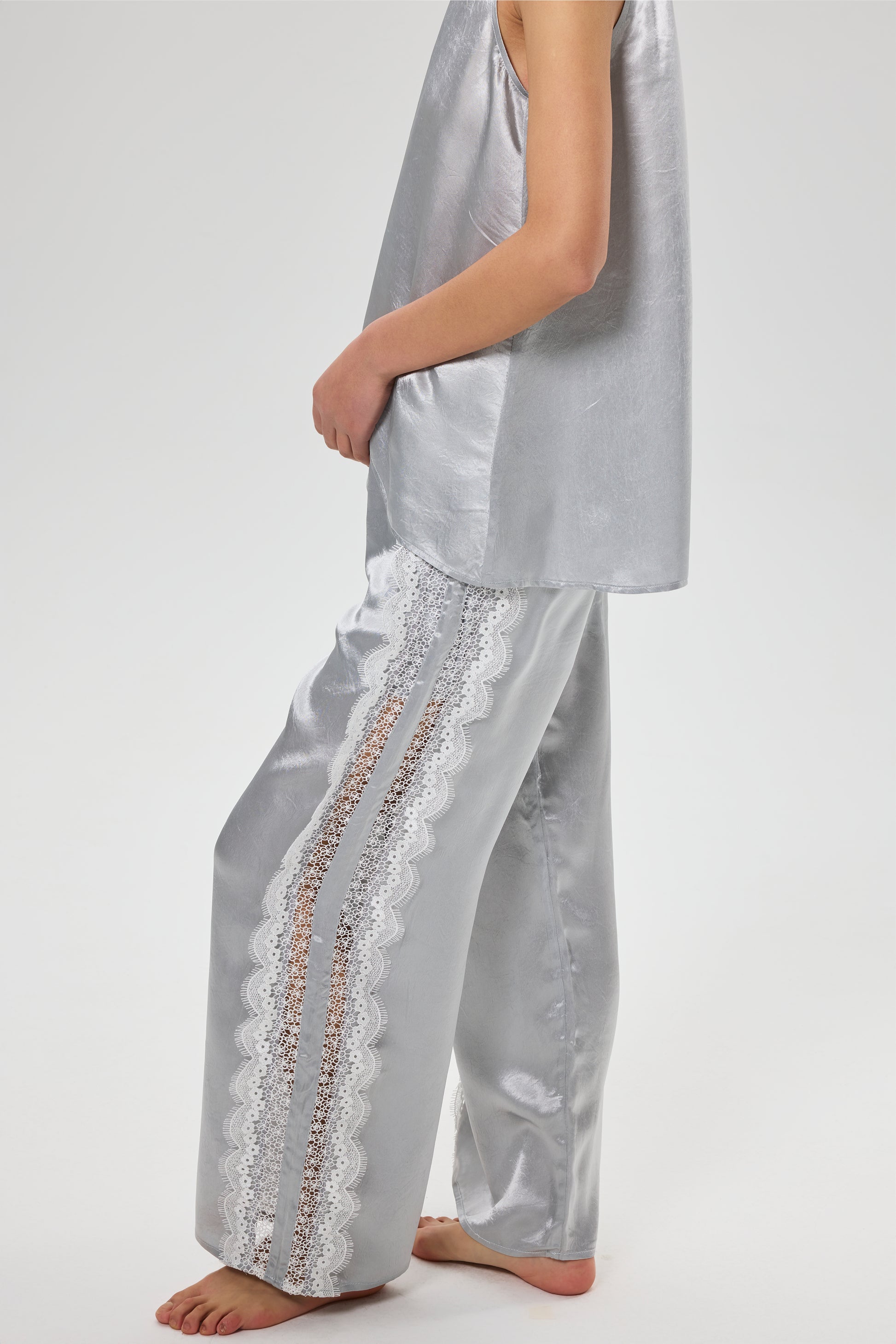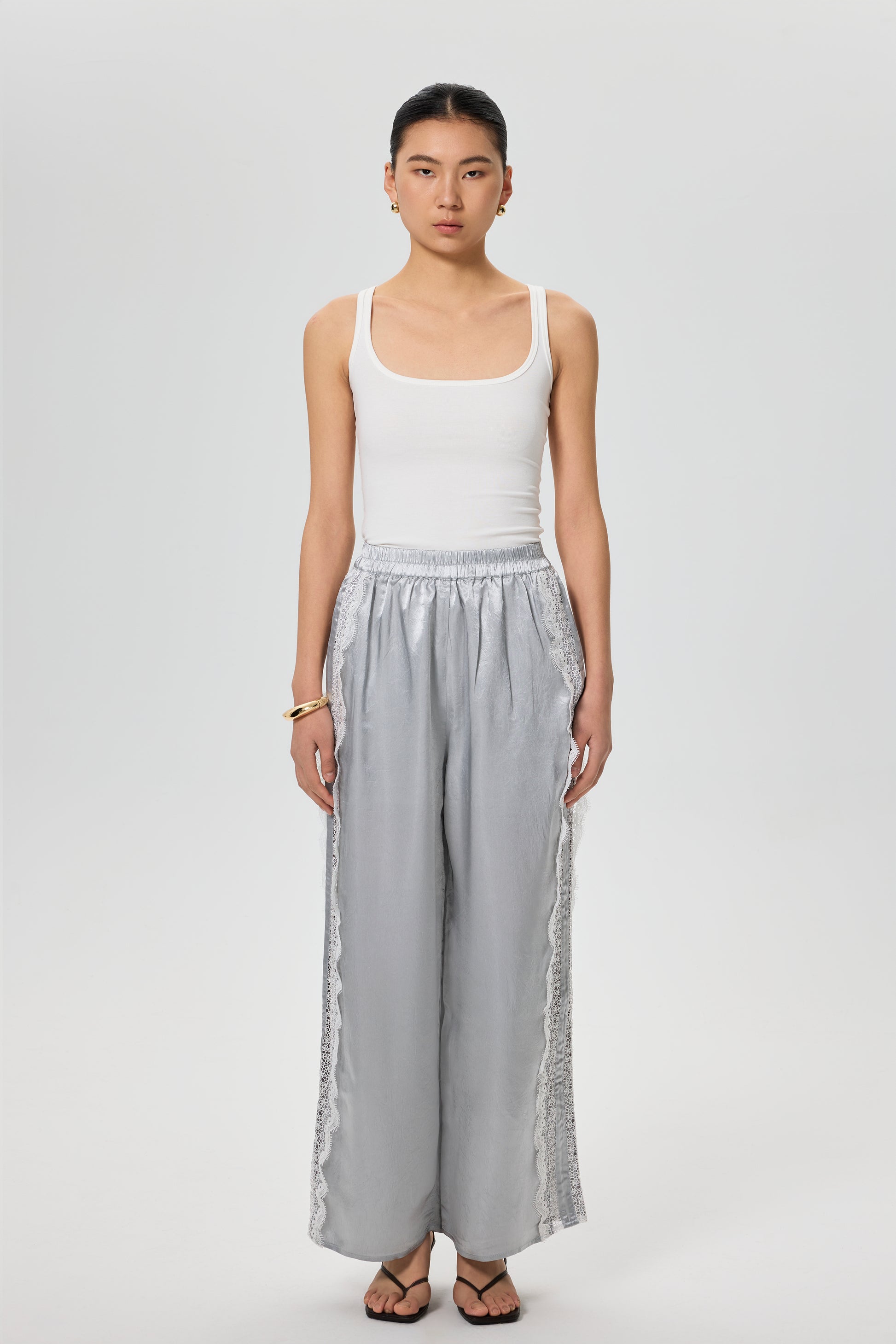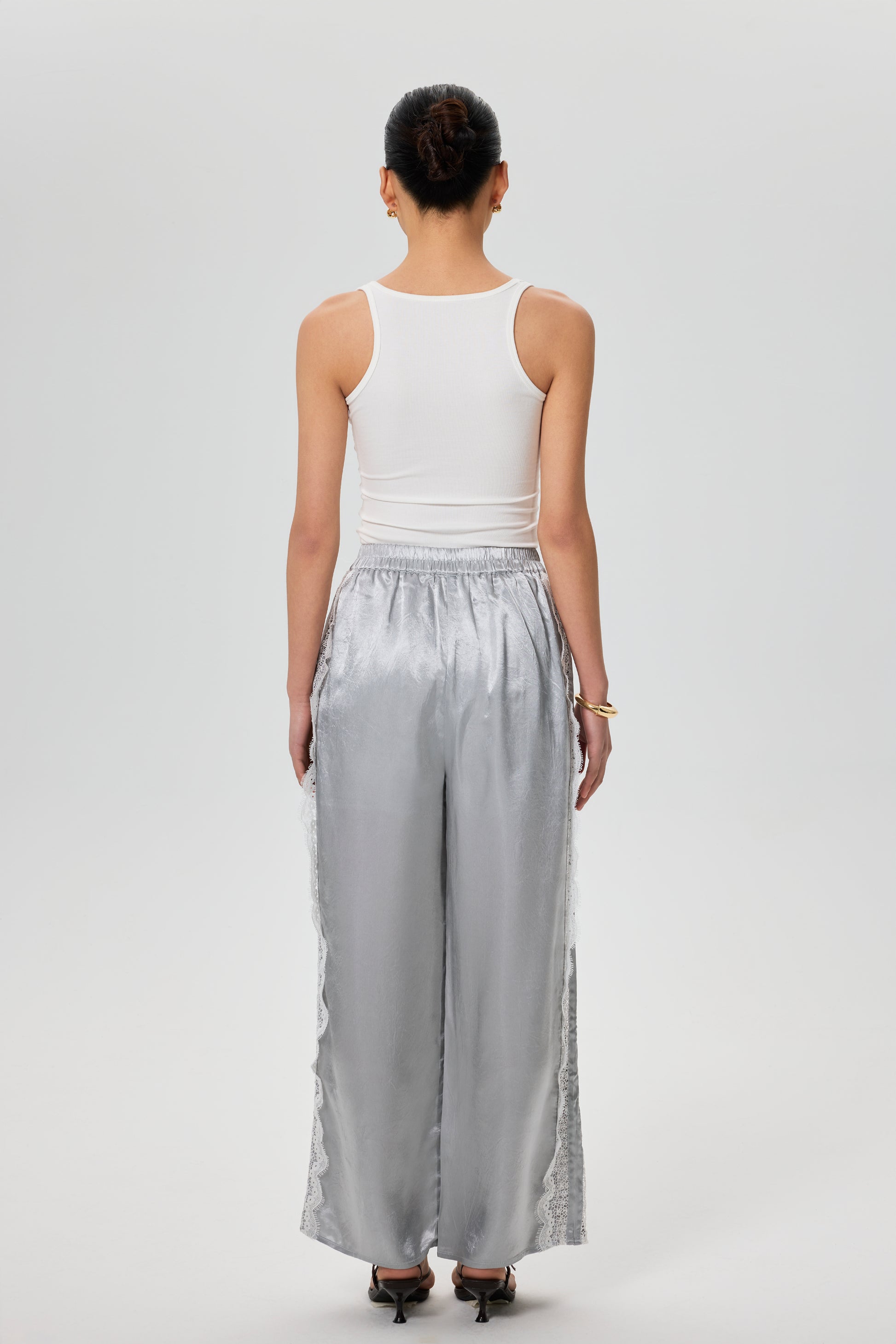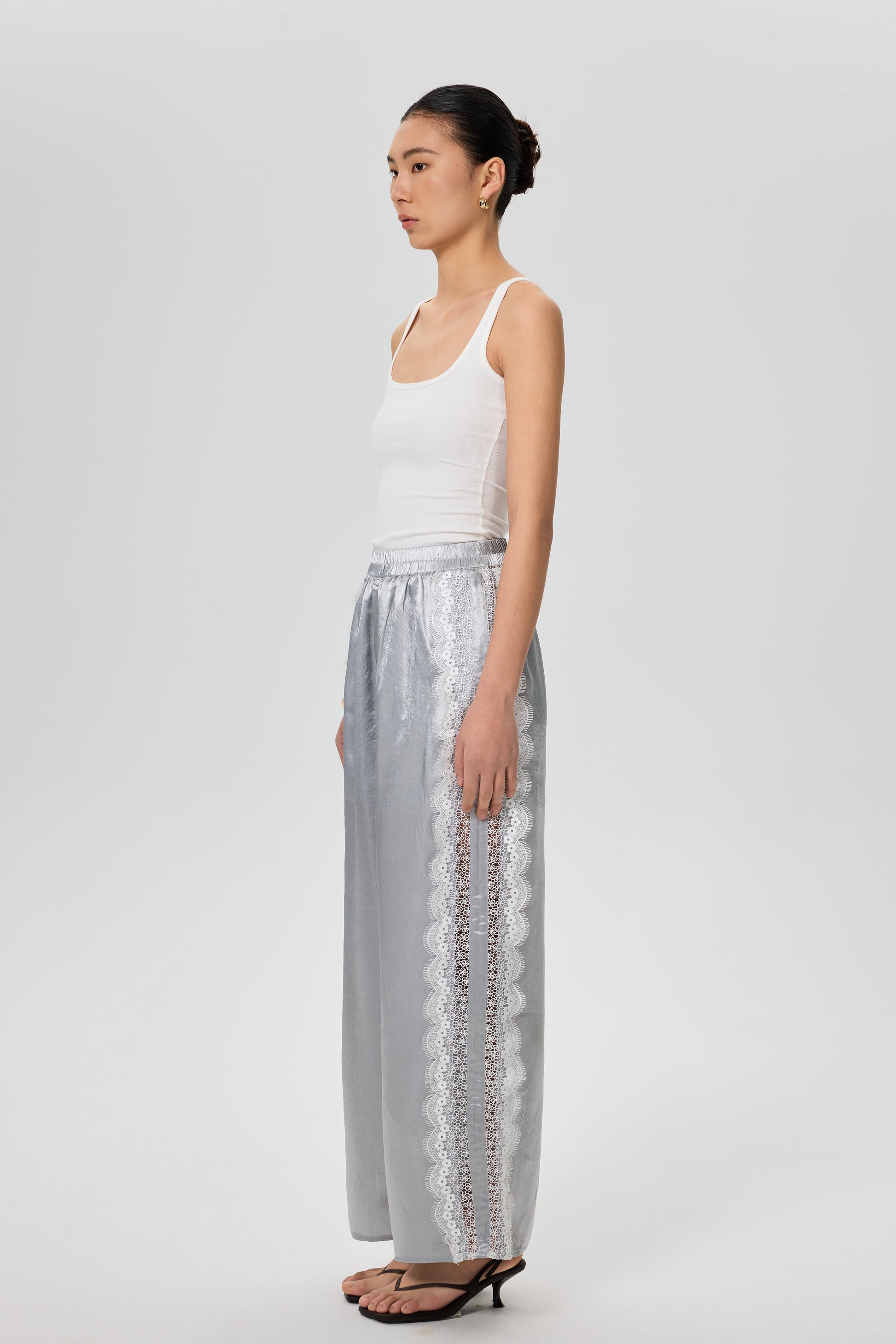 Crafted from luxurious triacetate in a sophisticated Moonlit Silver. Featuring exquisite lace detailing along the side seam that flows from the top to the bottom, these pants offer a stunning fusion of elegance and modern design. The flattering A-line silhouette ensures a graceful fit, making the Lyra Pant a perfect choice for formal occasions or festive celebrations.