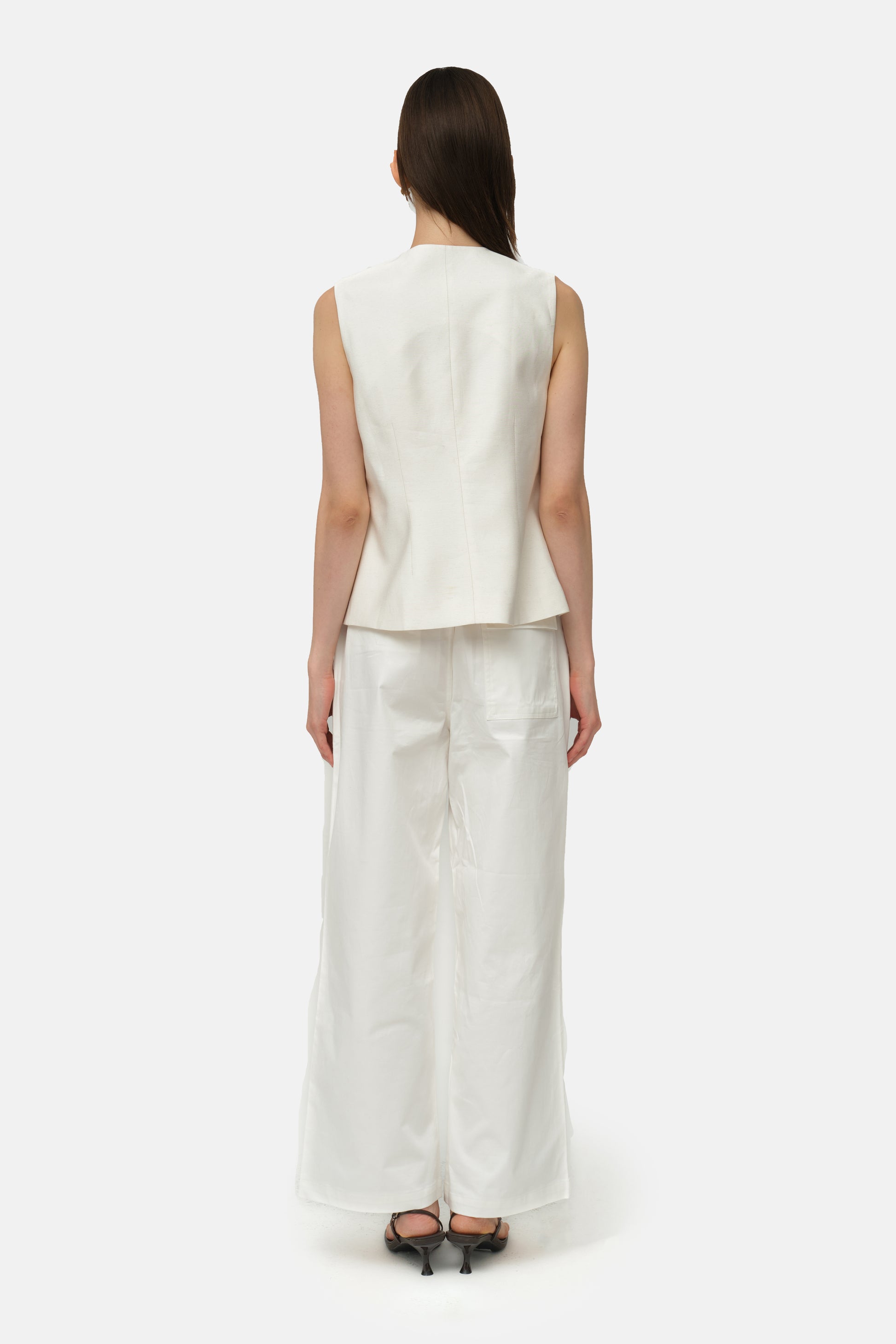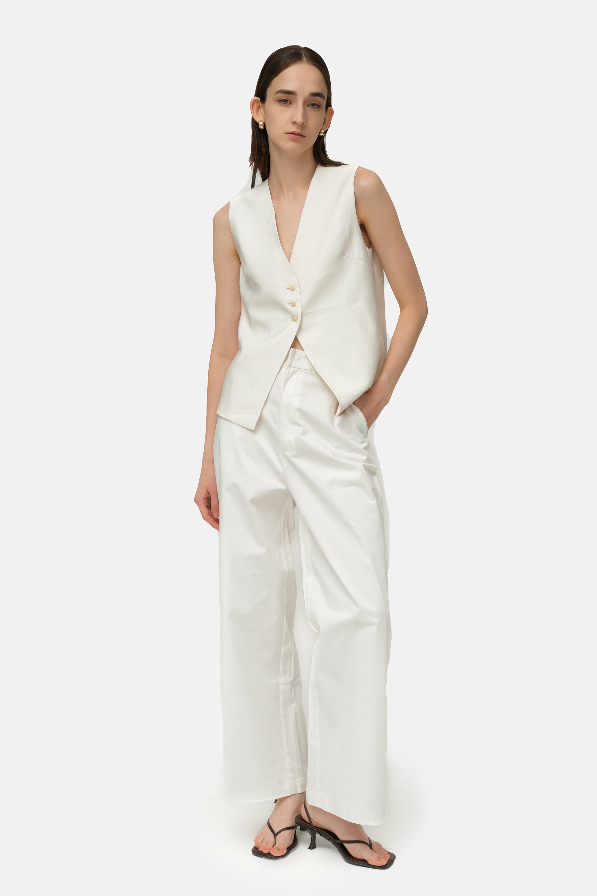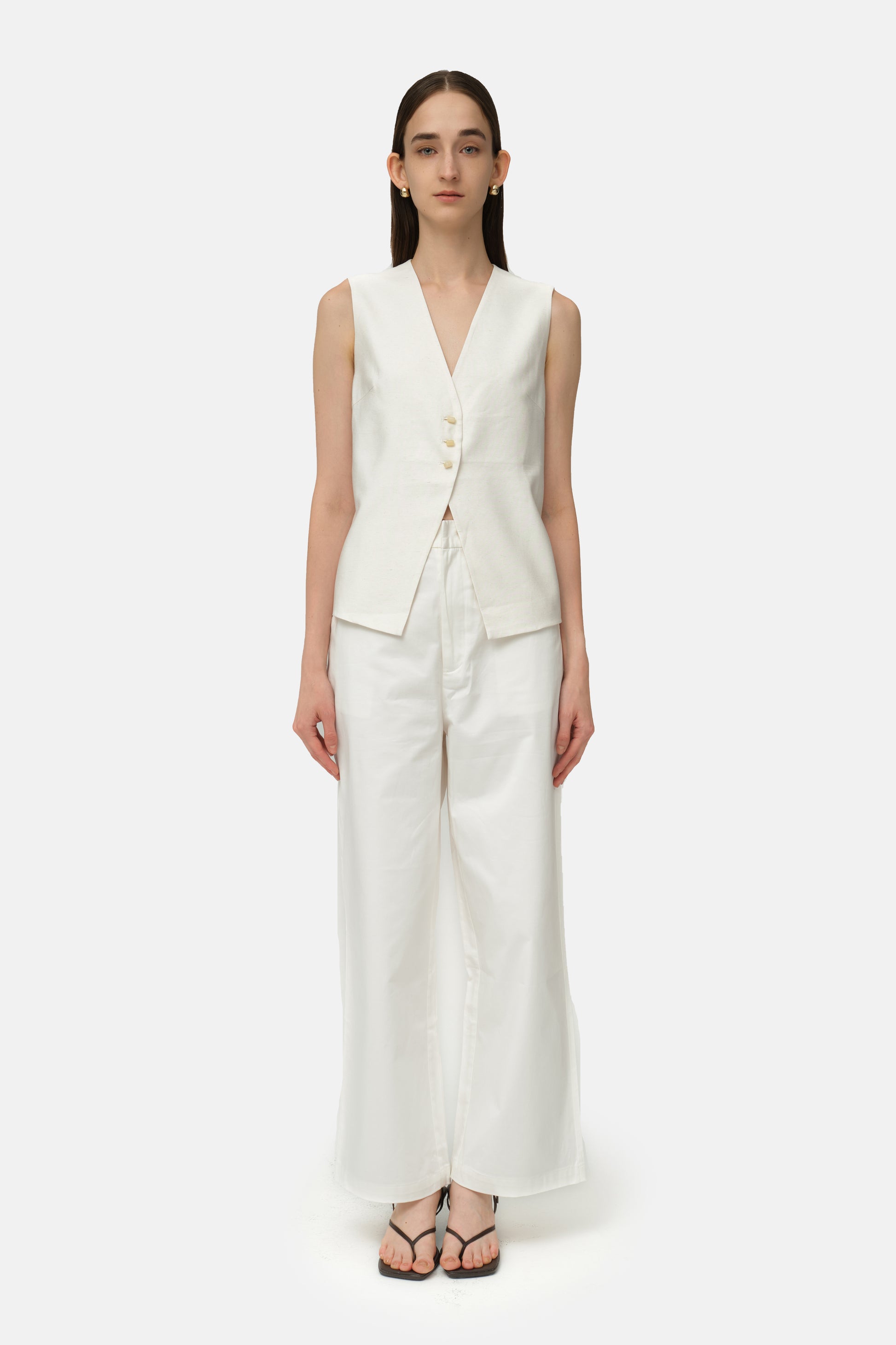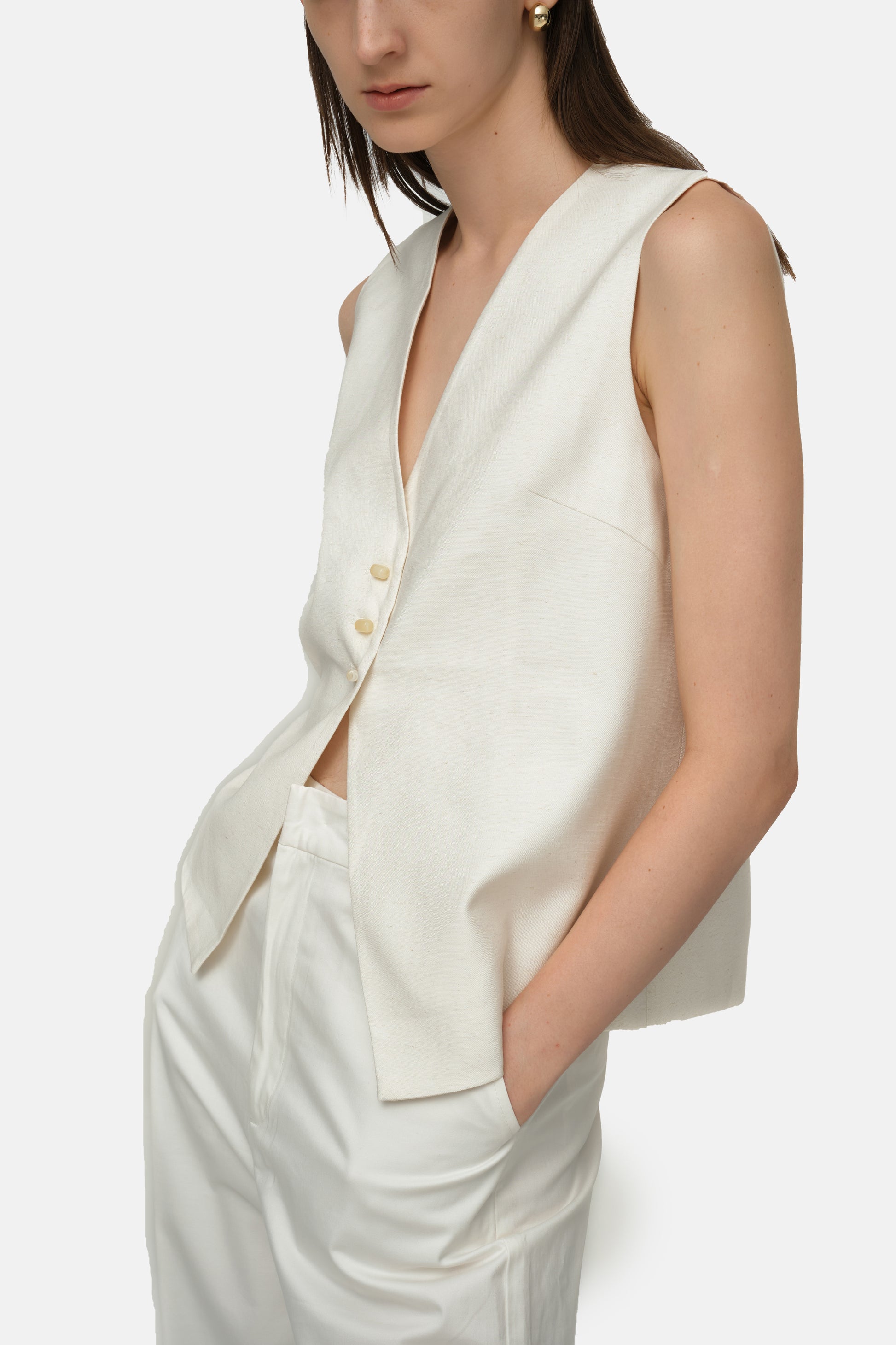 The Marble Vest is an elegant piece crafted from a soft viscose blend in a refined ivory colour, featuring a chic stone-like button and a sand-like pattern. With its tailored V-neck silhouette, the Marble Vest is perfect for both holiday vibes and professional settings.
