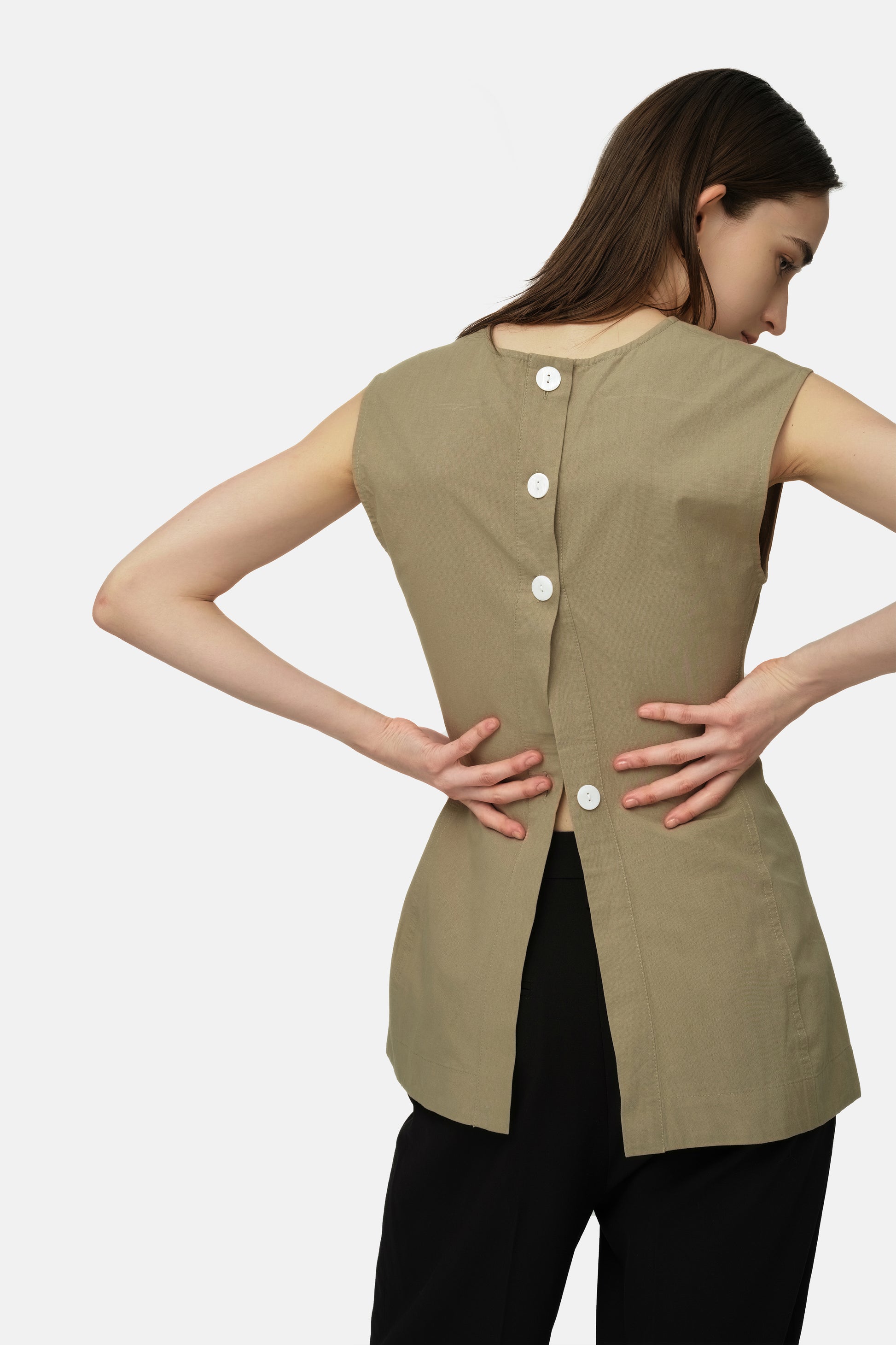 Crafted from a signature linen and cotton blend, the Seville Reverse Top features a button closure at the back and a flattering waist-cinching design. Combining elegance with a tailored fit. Ideal for resort, street, and office settings alike.